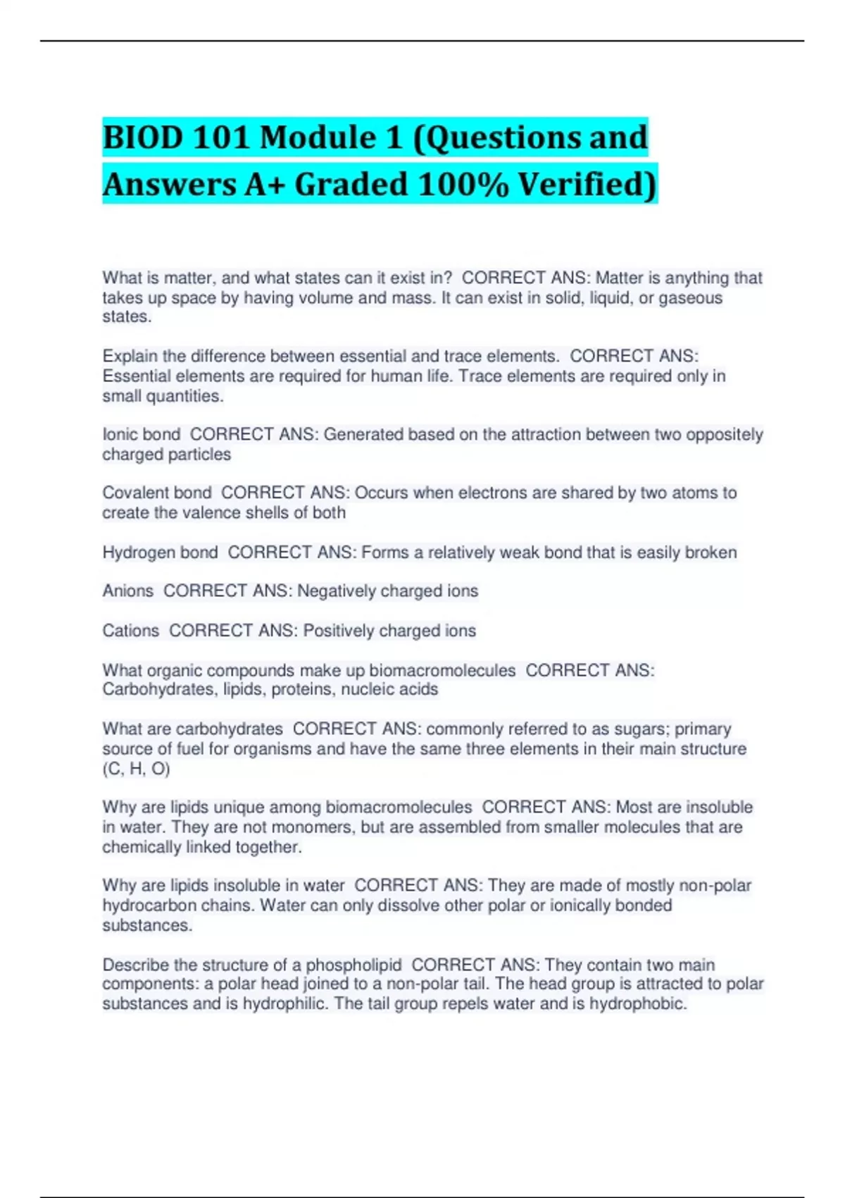 BIOD 101 Module 1 (Questions and Answers A+ Graded 100% Verified)BIOD 101 Exam 2 (Questions and Answers A+ Graded 100% Verified)Biology 101 - module 3 (A+ Graded 100% Verified)BIOD 101 FINAL (Questions and Answers A+ Graded 100% Verified) Bio 101- Module #4 (Questions and Answers A+ Graded 100% Verified)Bio 101 Module 5 (Questions and Answers A+ Gr