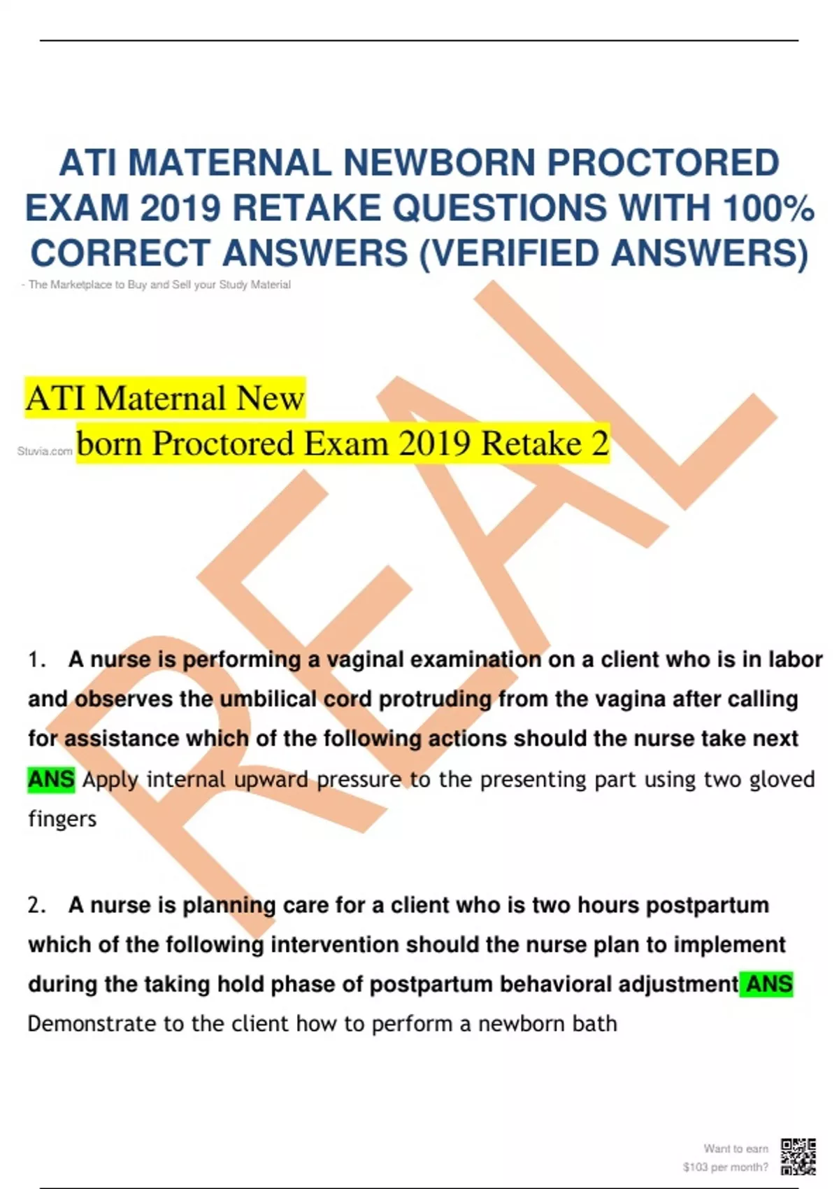 ATI MATERNAL NEWBORN PROCTORED EXAM RETAKE QUESTIONS WITH 100% CORRECT ANSWERS (VERIFIED ANSWERS)