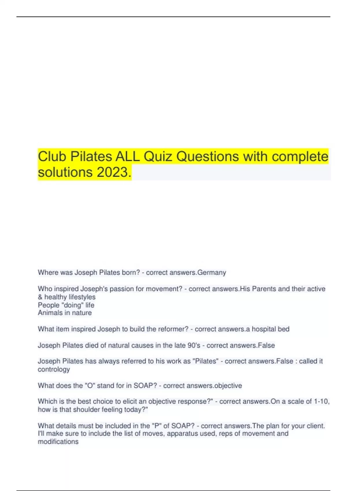 Pilates test out questions and answers verified and updated.Pilates Anatomy U2 Muscular System questions and answers 100% guaranteed success.Anatomy Definitions Club Pilates questions and answers well illustrated.Club Pilates Sales Trivia questions and answers verified and updated.Club Pilates written exam questions and answers well illustrated.