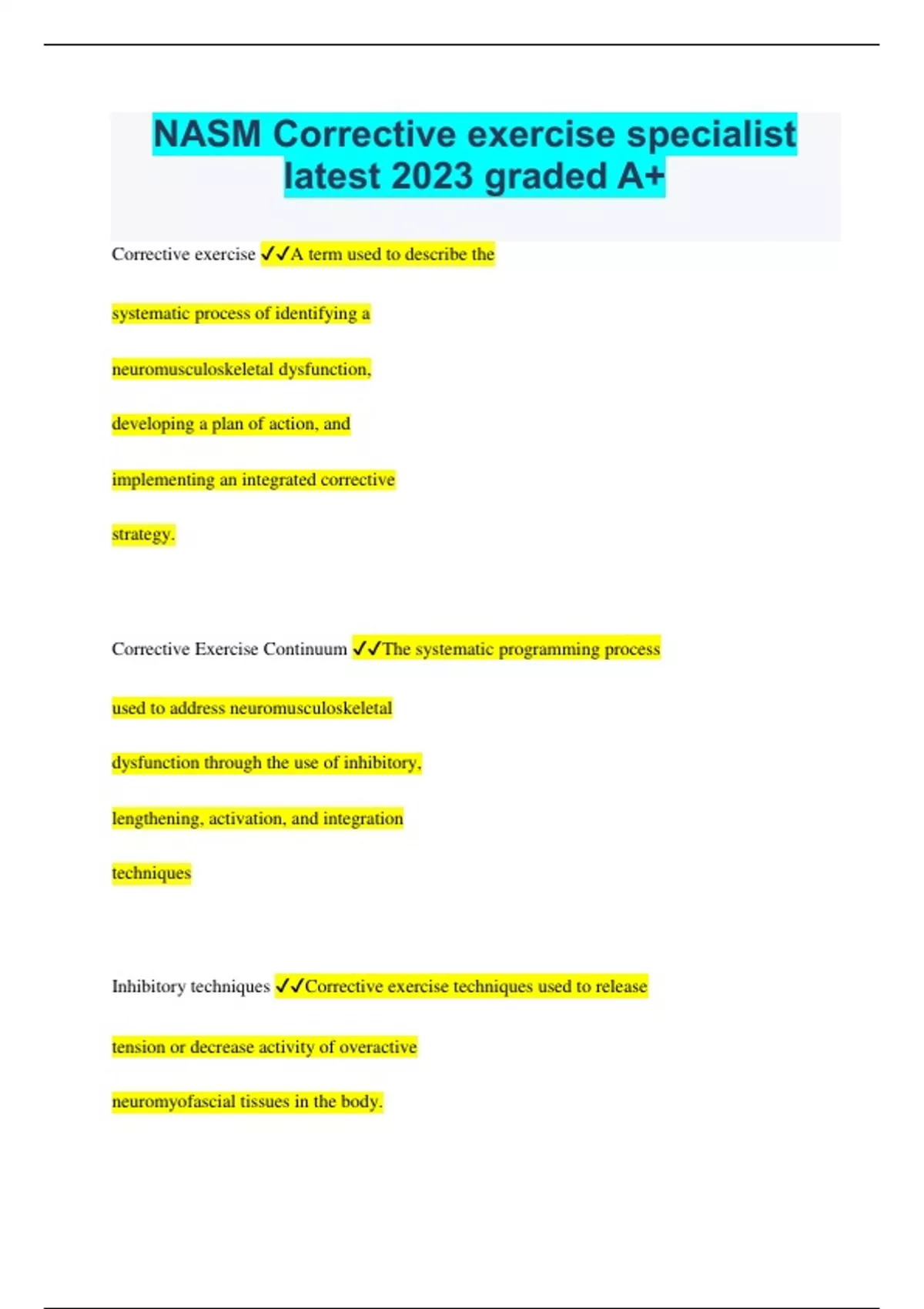 Corrective Exercise Specialist Bundled Exams Questions and Answers 100% Solved