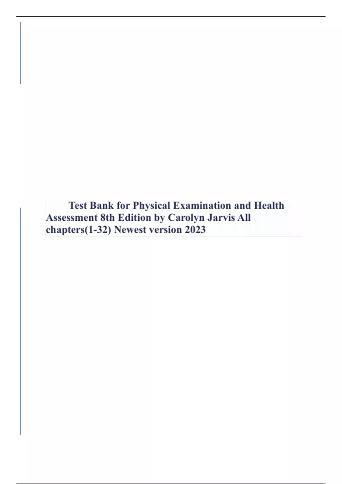 1 Exam (elaborations) Test Bank for Physical Examination and Health Assessment 8th Edition by Carolyn Jarvis All chapters(1-32) Newest version 2023 2 Exam (elaborations) Test Bank for Physical Examination and Health Assessment 9th Edition Jarvis All Chapters | A+
