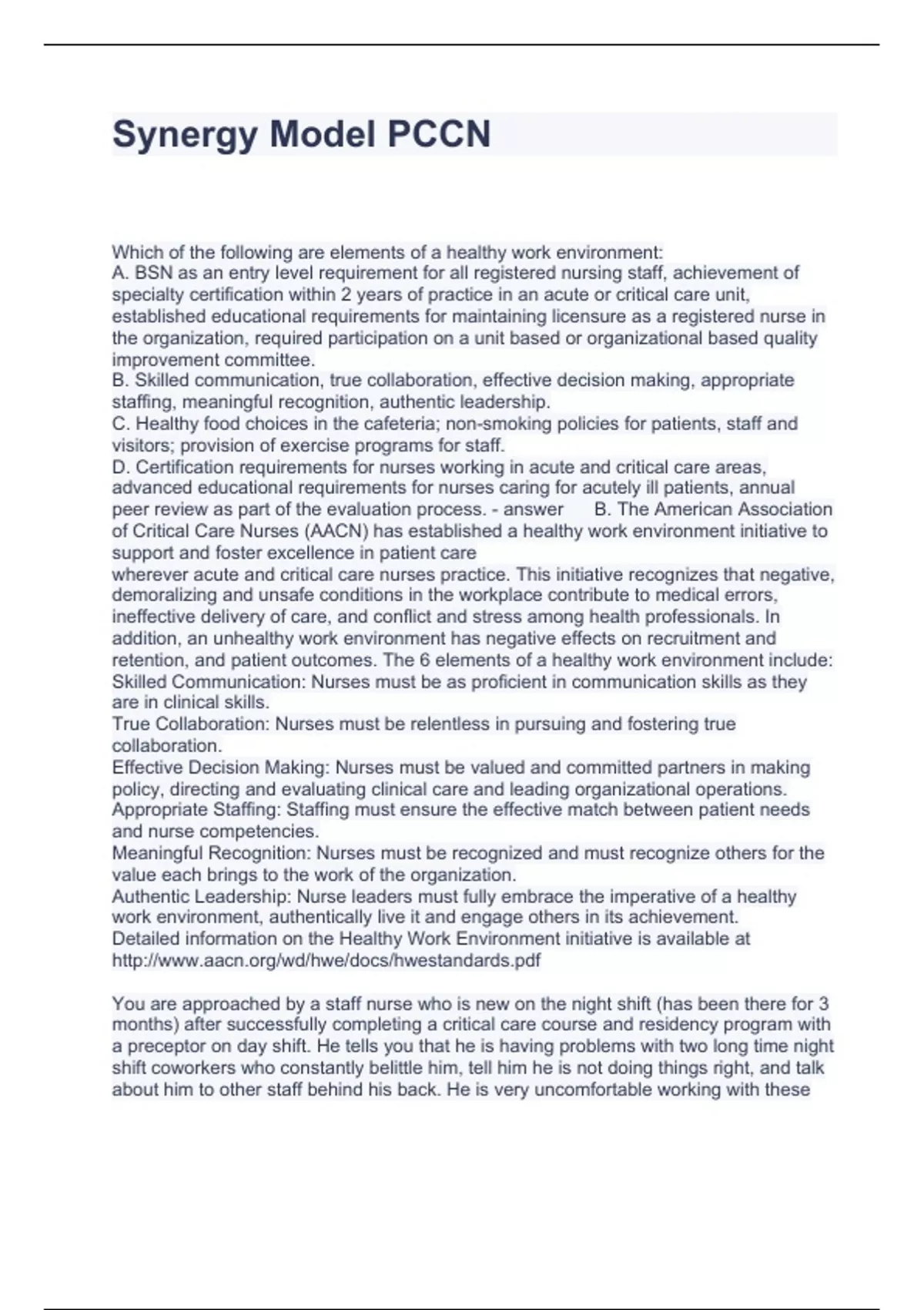 Synergy Model PCCN Questions and Answers 2023