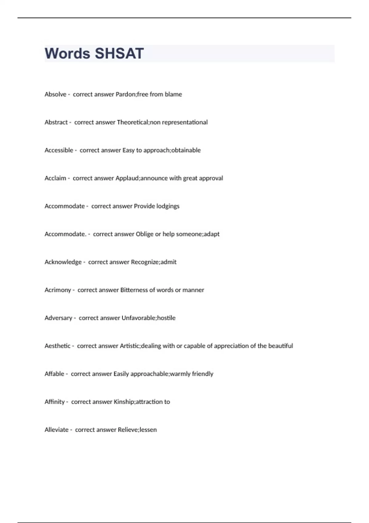 1 Exam (elaborations) 300 Words To Know For SHSAT updated to pass 2 Exam (elaborations) Conversions for SHSAT correctly answered rated A+ 2023 3 Exam (elaborations) Full Ssat vocabulary list question n answers 2023 passed 4 Exam (elaborations) Grammer Rules SHSAT 2018 updated to pass 5 Exam (elaborations) HSPT TACHS SHSAT MATH question n answer