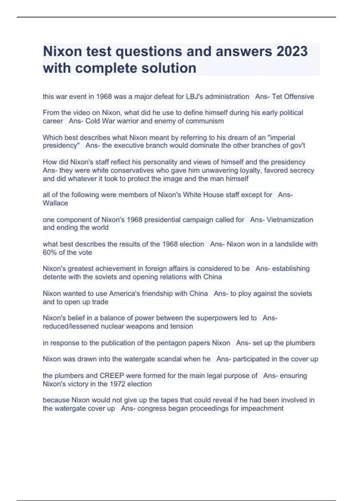 Nixon test questions and answers 2023 with complete solution Nixon to Obama test review questions and answers 2023 Nixon Test Review questions and answers 2023 with complete solution Nixon Test Actual Questions and Answers 2023 with complete solution