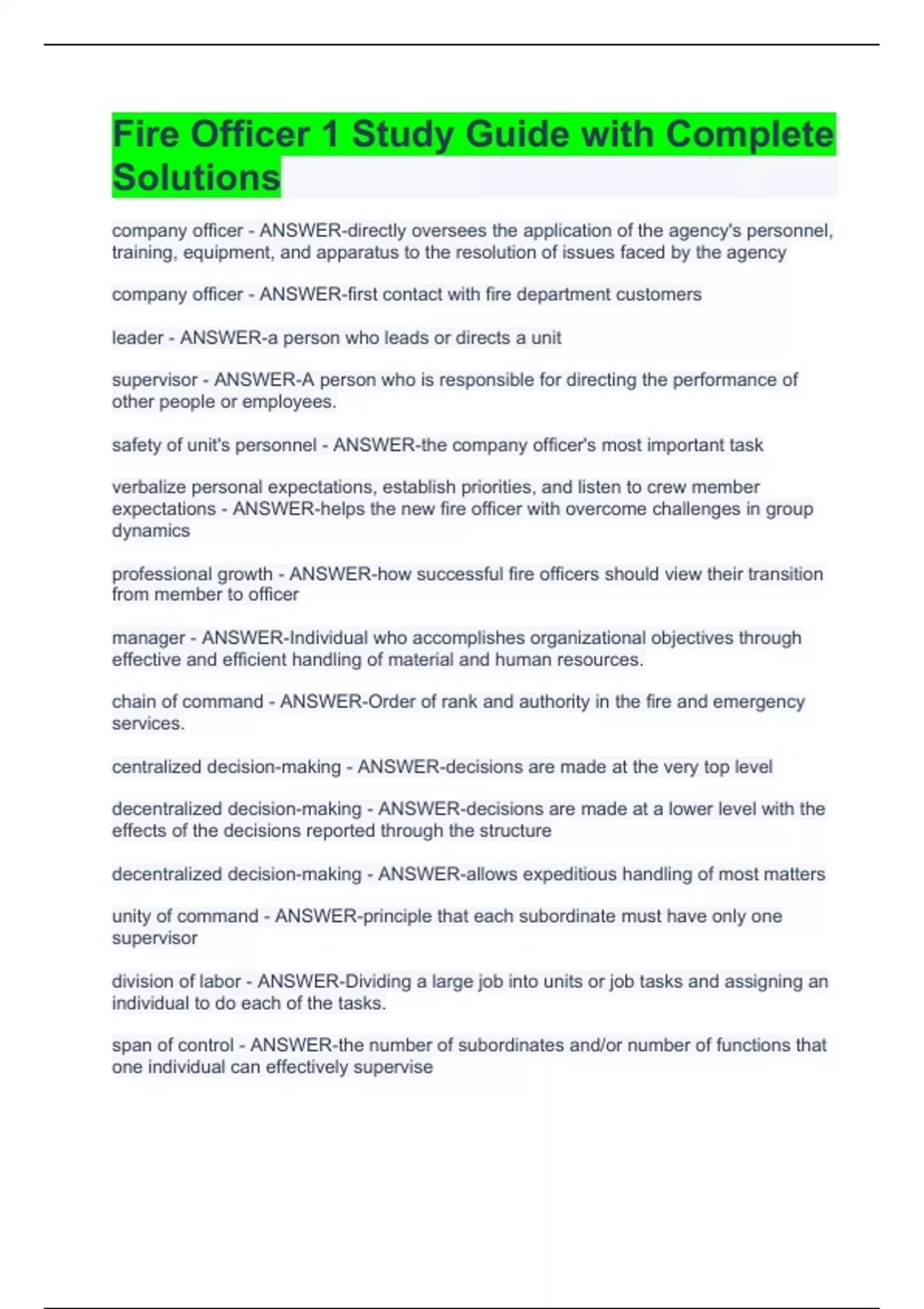 Exam (elaborations) Fire Officer 1 Study Guide with Complete Solutions 2 Exam (elaborations) Fire Officer 1 exam prep with complete solutions 3 Exam (elaborations) Fire Officer 1 - Multiple Choice Exam Answered 100% Correct 4 Exam (elaborations) Fire Officer Chapter 1 Questions and Answers Graded A+ 5 Exam (elaborations) Florida Fire Officer 1