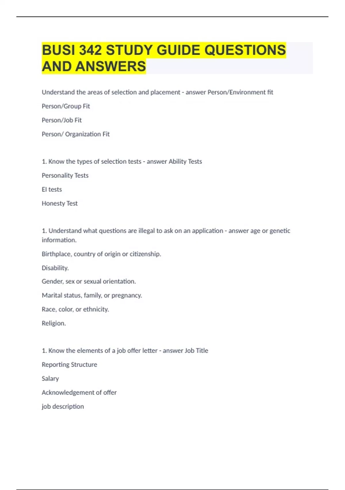 BUSI 342 STUDY GUIDE QUESTIONS AND ANSWERS
