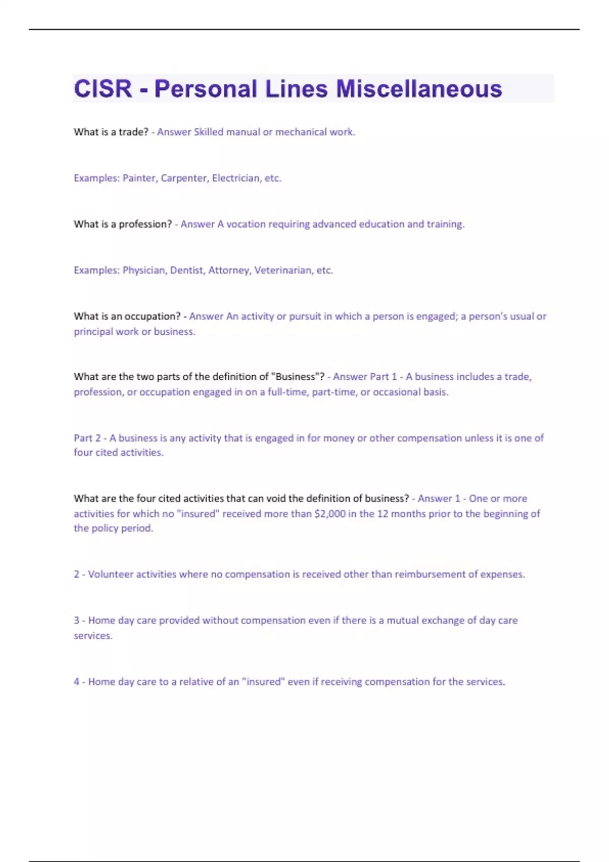 CISR - Personal Lines Miscellaneous Exam Rated 100% Correct!!