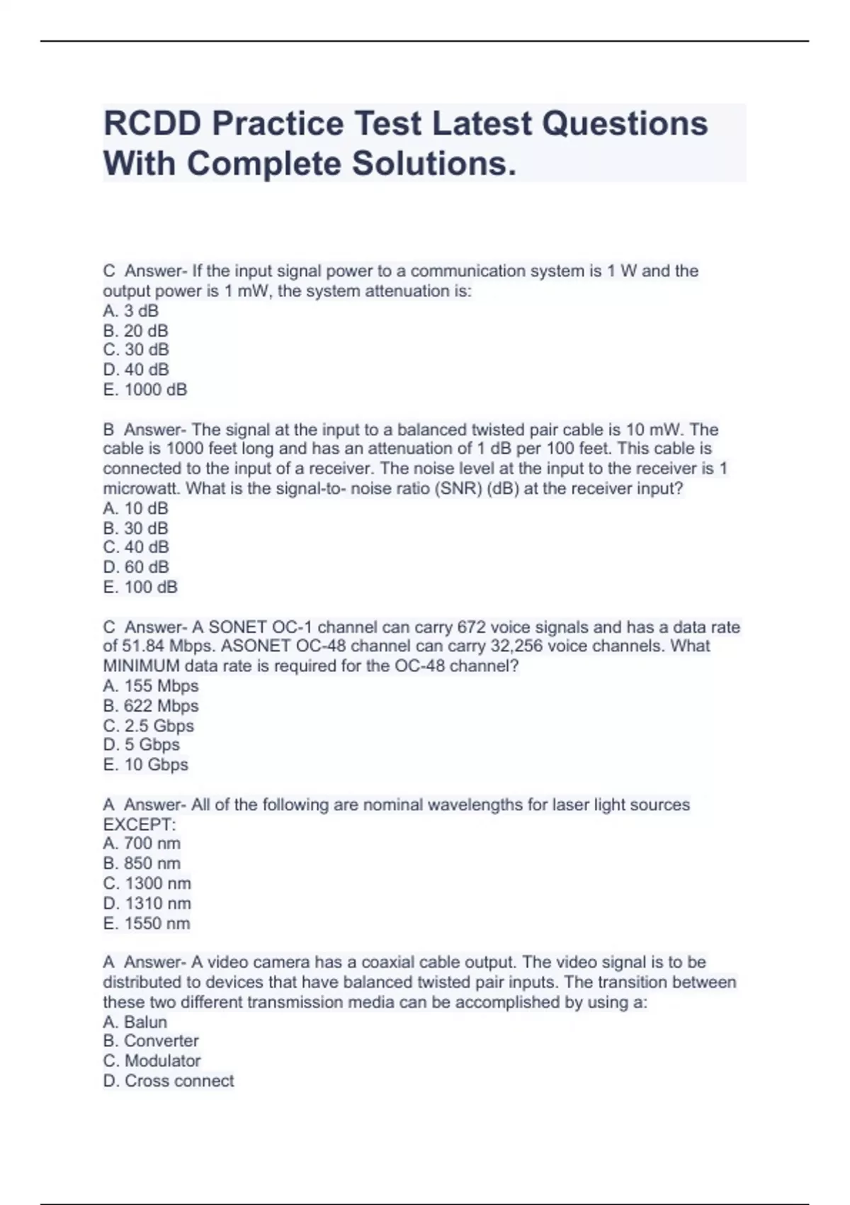 RCDD Practice Test Latest Questions With Complete Solutions.,RCDD Test TDMMV14 (Questions taken from Review Courses DD101, DD102, and the BICSI RCDD Study Guide) Questions Answered Correctly To Score A+,RCDD TEST QUESTIONS (TOPIC 1 - TOPIC 7) WITH COMPLETE SOLUTIONS.,RCDD TEST QUESTIONS (TOPIC 1 - TOPIC 7) WITH COMPLETE SOLUTIONS.,RCDD TEST QUESTIO