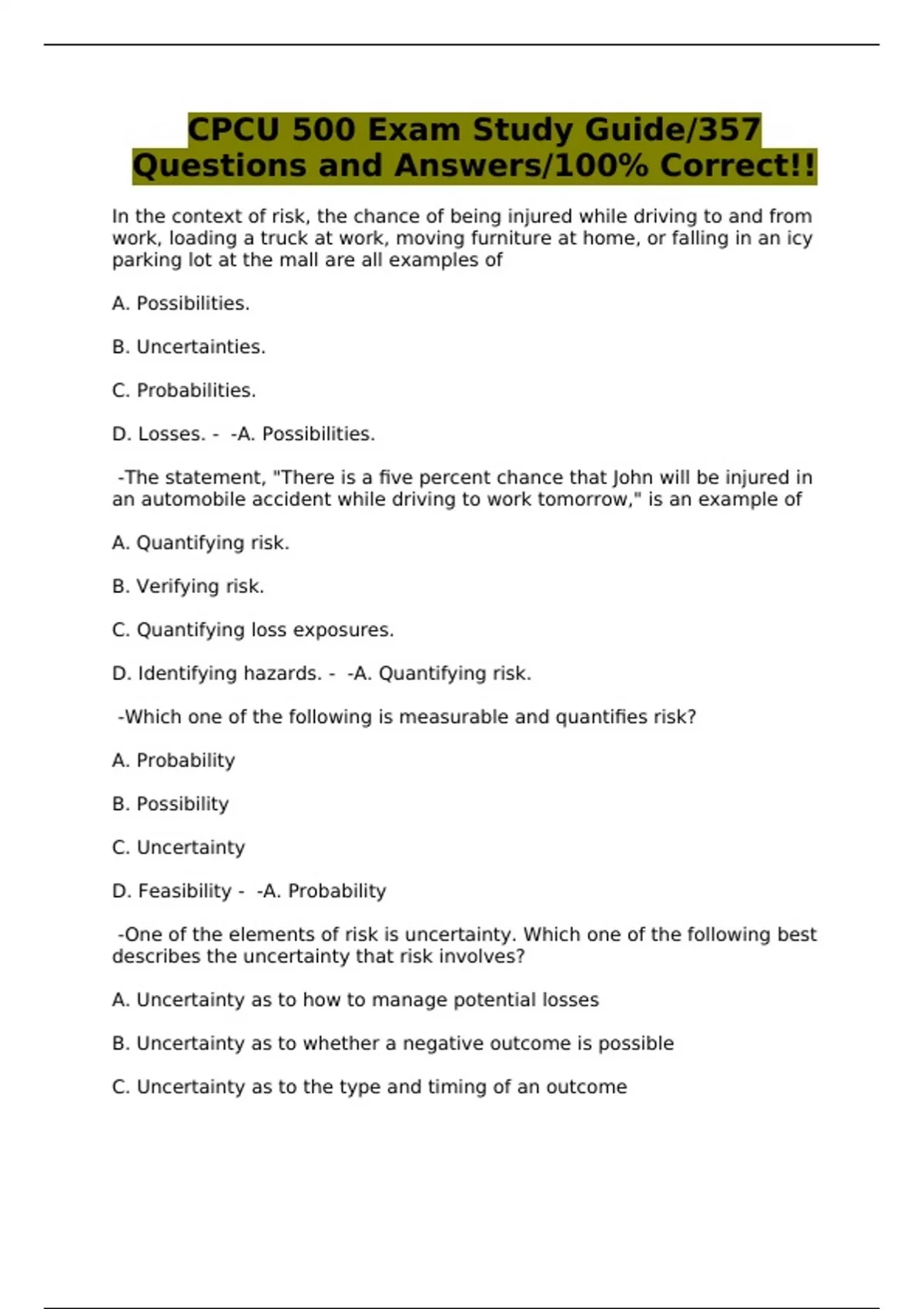 CPCU 500 EXAMS - QUESTIONS AND ANSWERS - COMPLETE BUNDLE