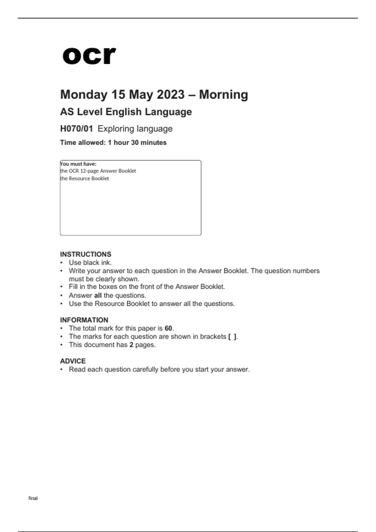 ocr AS Level English Language H070/01 June2023 Mark Scheme and Question Paper. ocr AS Level English Language H070/01 May2023 Question Paper. ocr AS Level English Language H070/01 June2023 Mark Scheme. H070/01 MS and QP