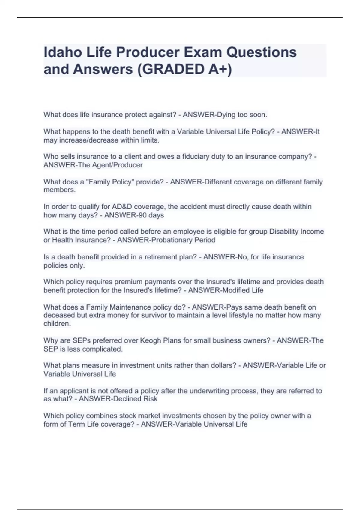Idaho Life Producer Exam Questions and Answers (GRADED A+)