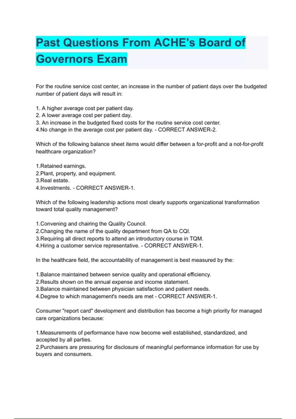 ACHE FACHE BOG EXAMS STUDY BUNDLE 2023/2024 COMPLETE SOLUTION