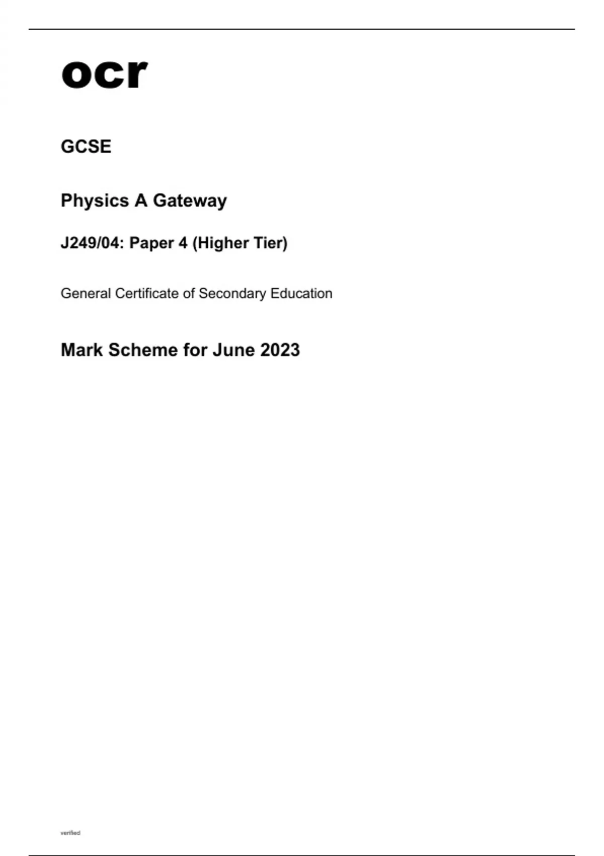 ocr GCSE Physics A Gateway (J249/04) MARK SCHEME AND QUESTION PAPER June2023. ocr GCSE Physics A (Gateway Science) (J249/04) QUESTION PAPER June2023. ocr GCSE Physics A Gateway (J249/04) MARK SCHEME June2023. (J249/04) MS AND QP