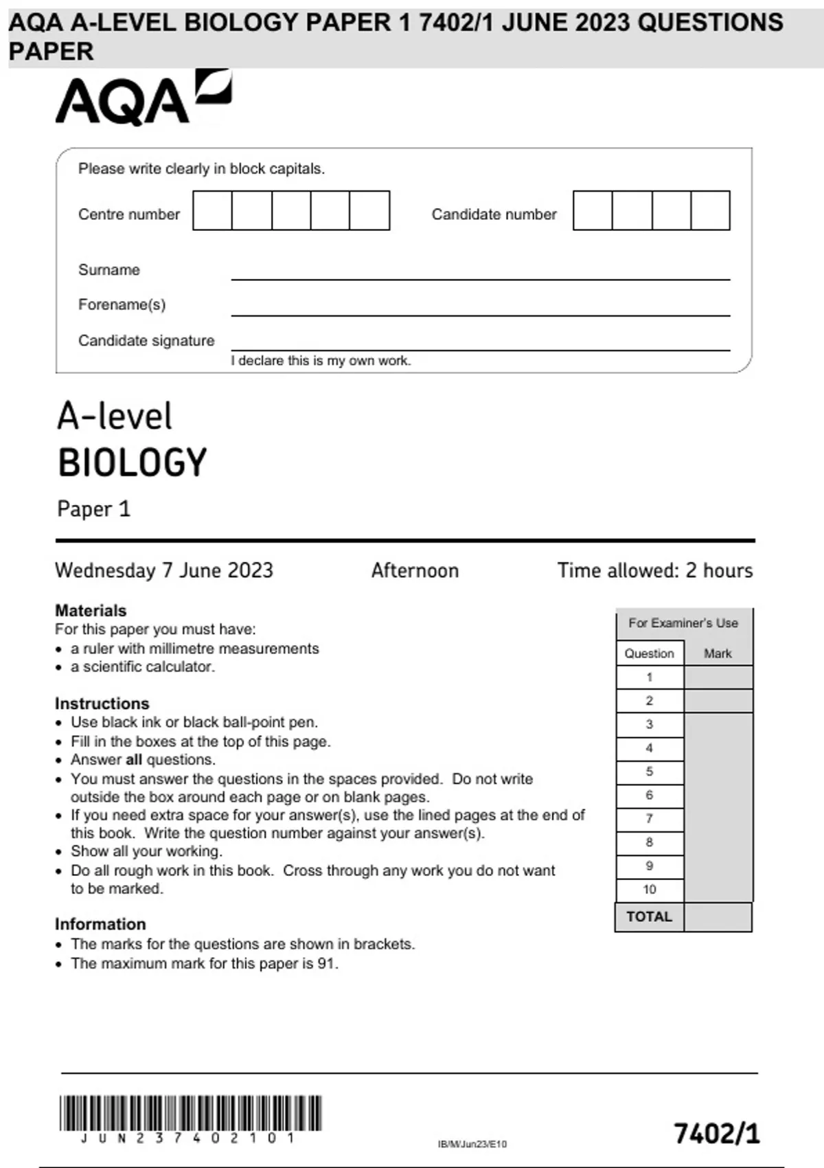 AQA A-LEVEL BIOLOGY PAPER 1 7402/1 JUNE 2023 QUESTIONS PAPER