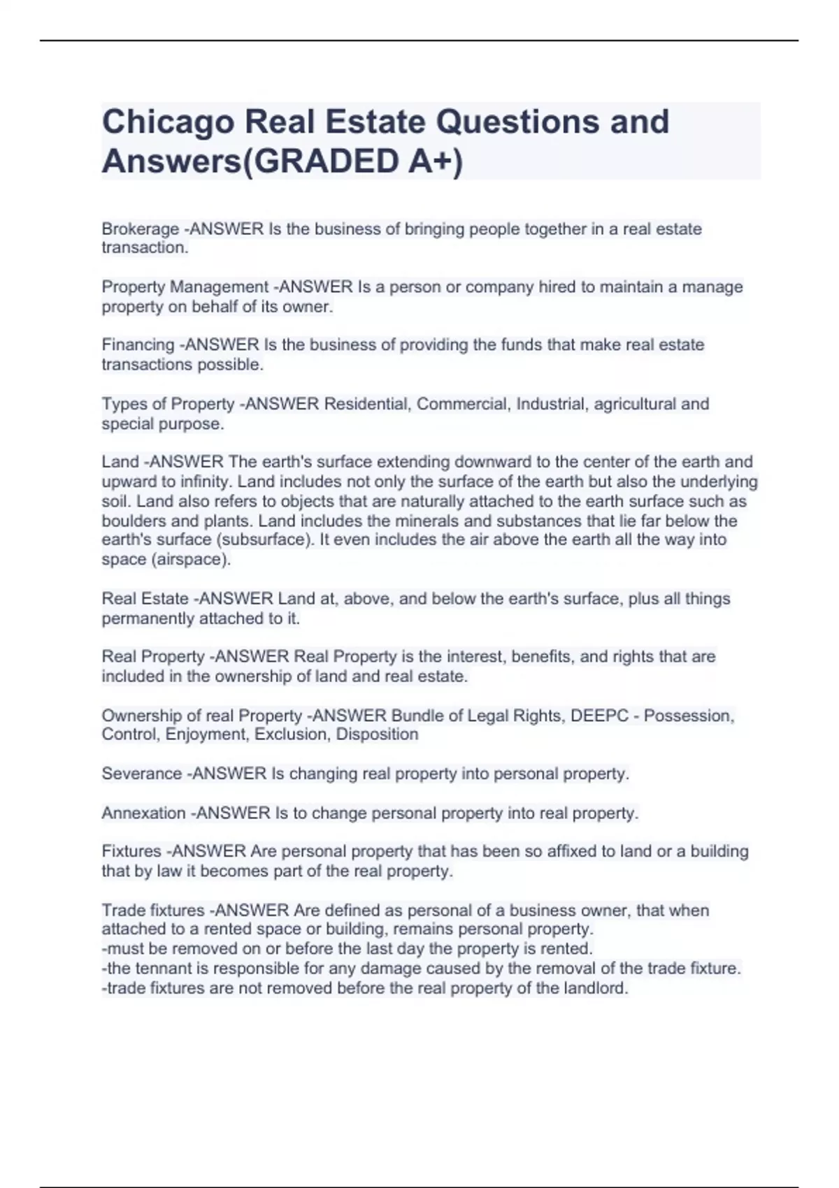 Chicago Real Estate Exam Questions and Answers(RATED A+)