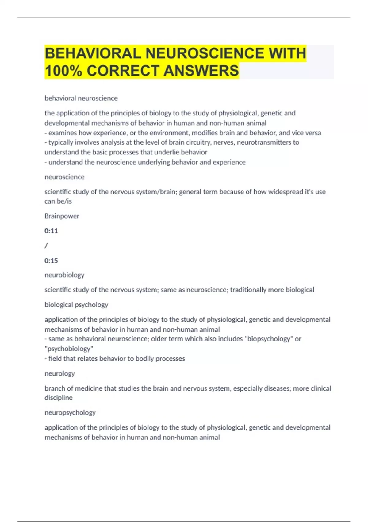 NEUROSCIENCE AND BEHAVIOR WITH COMPLETE VERIFIED SOLUTIONS.