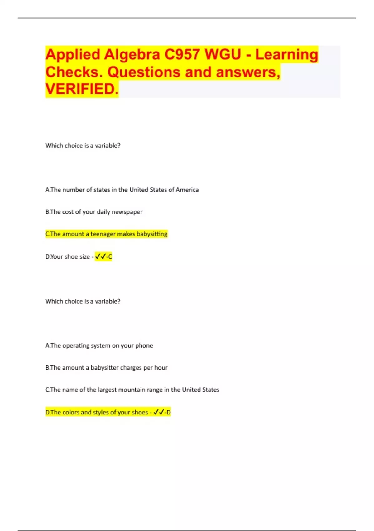 Applied Algebra C957 WGU - Learning Checks. Questions and answers, VERIFIED