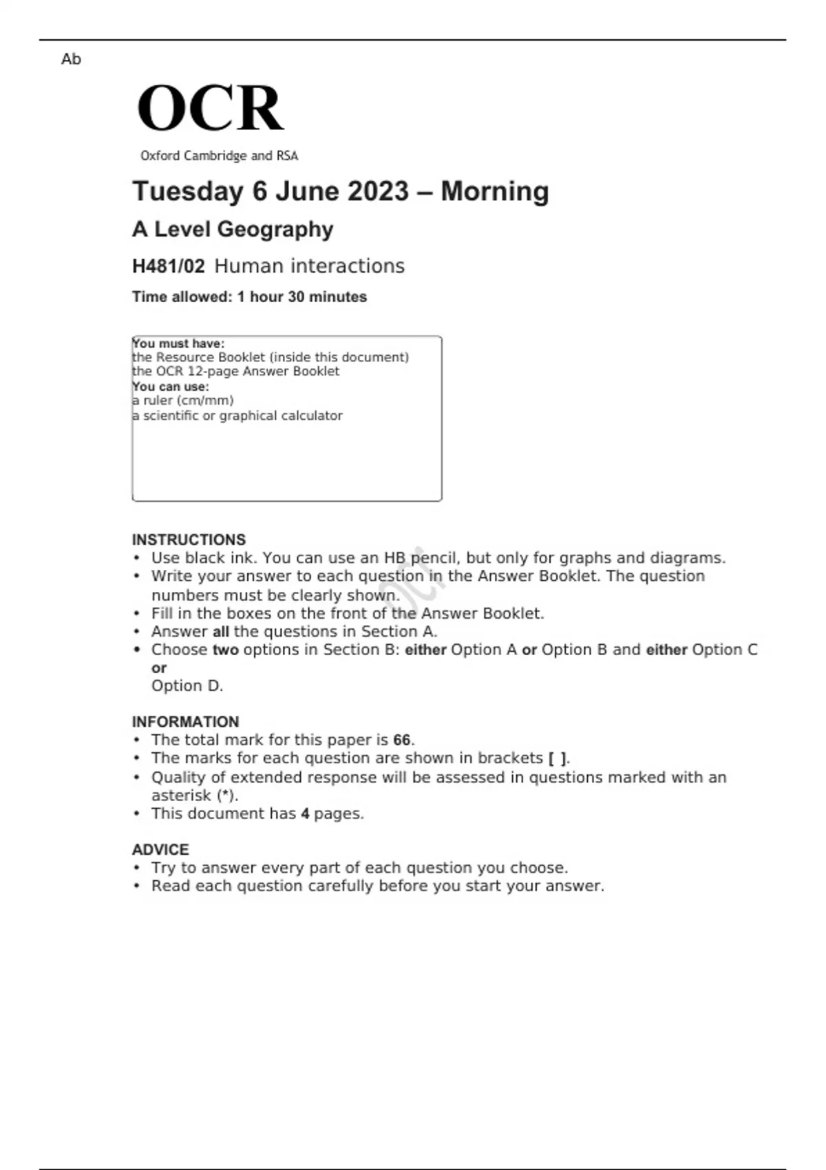 OCR A Level Geography H481/02 JUNE 2023 QUESTION PAPER AND MARK SCHEME