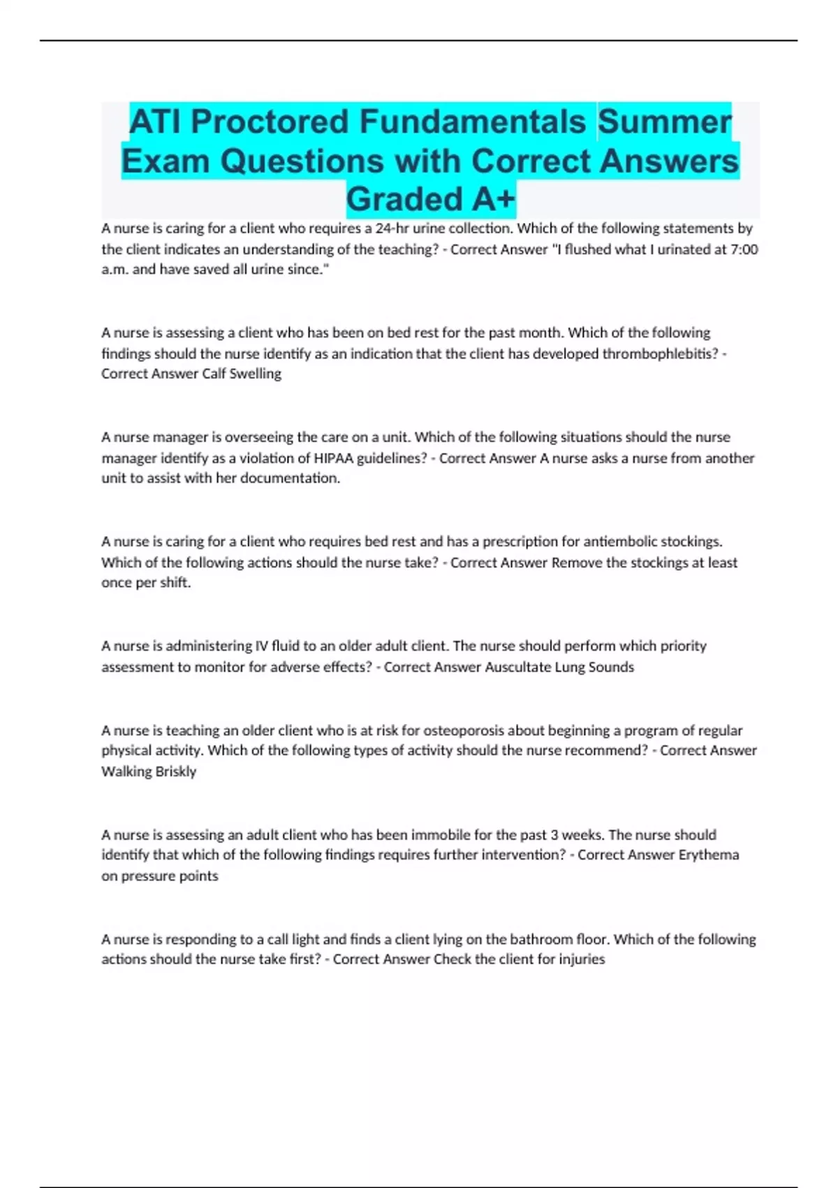 ATI Proctored Fundamentals Summer Exam Questions with Correct Answers Graded A+