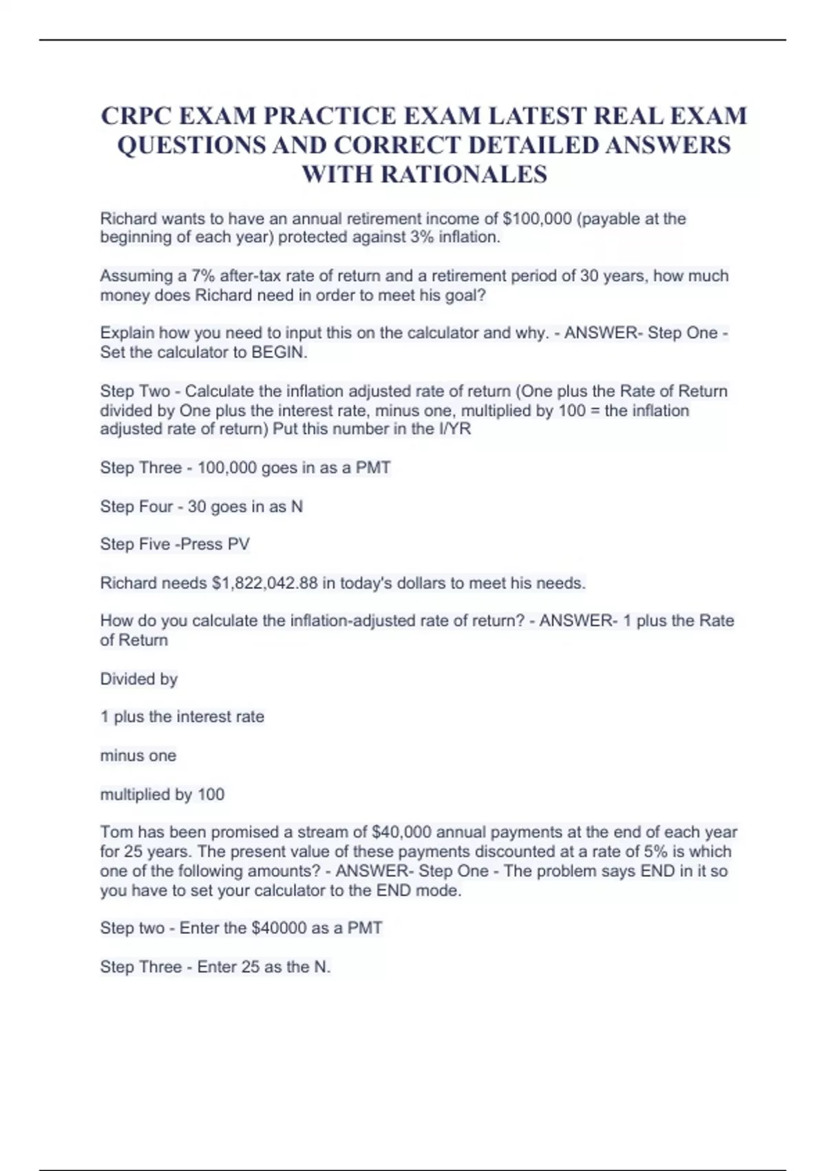 CRPC EXAM PRACTICE EXAM LATEST REAL EXAM QUESTIONS AND CORRECT DETAILED ANSWERS WITH RATIONALES TEST QUESTIONS CRPC MODULE 4 QUESTIONS WITH CORRECT DETAILED ANSWERS WITH SOLVED SOLUTIONS 2023 CRPC PRACTICE EXAM 2 QUESTIONS WITH CORRECT DETAILED ANSWERS 2023 CRPC SAMPLE TESTS LATEST QUESTIONS WITH CORRECT DETAILED ANSWERS 2023 ALREADY GRADED A+