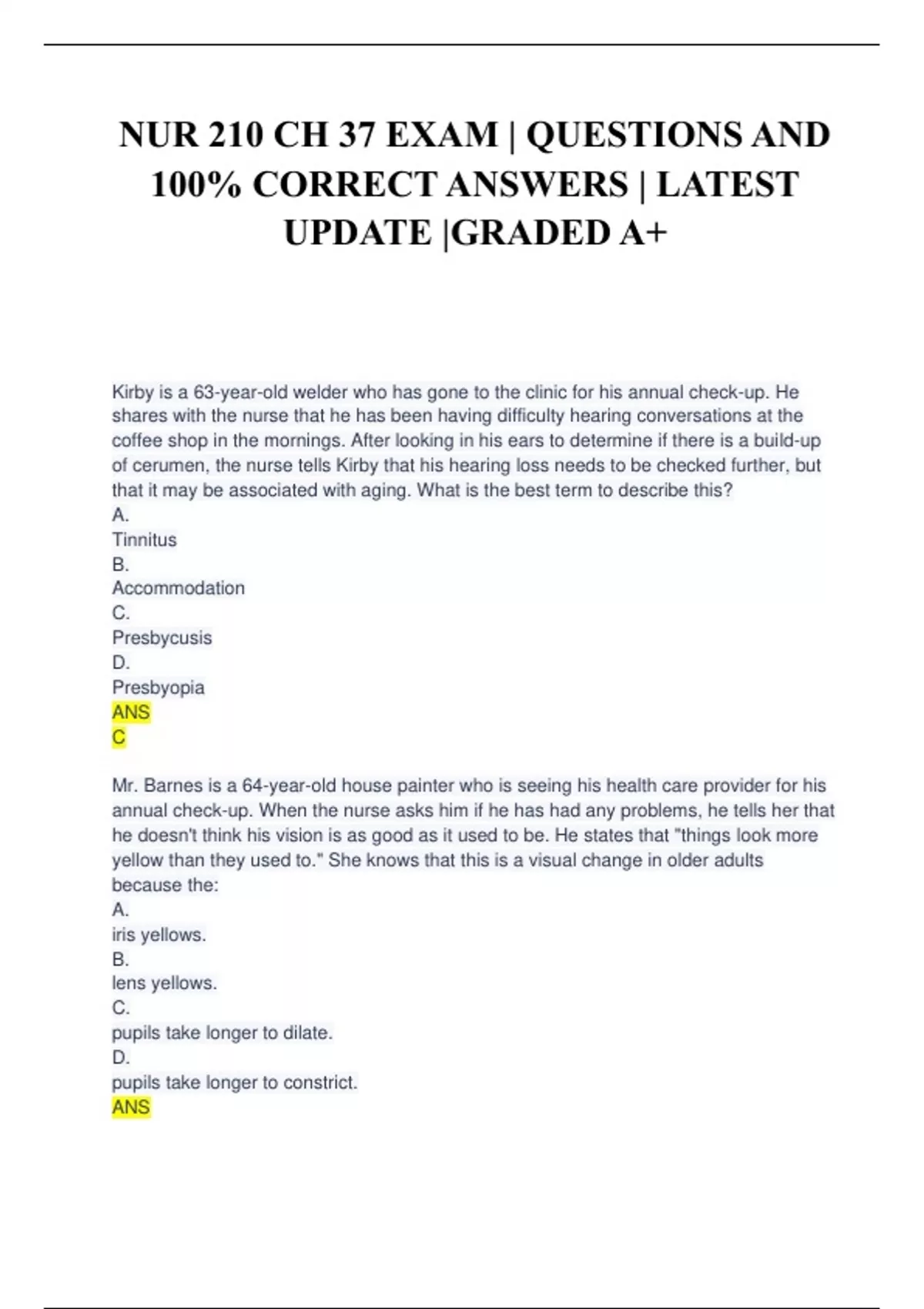 NUR 210 CH 37 EXAM | QUESTIONS AND 100% CORRECT ANSWERS | LATEST UPDATE |GRADED A+