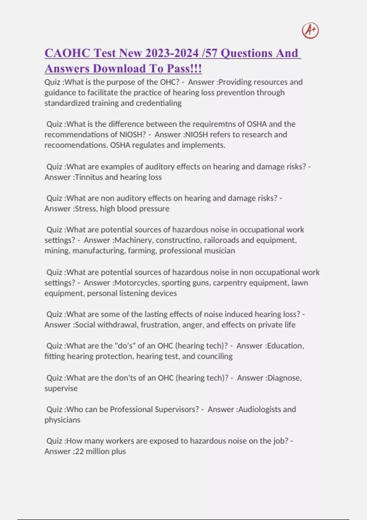 CAOHC Test New / Questions And Answers Download To Pass!!!