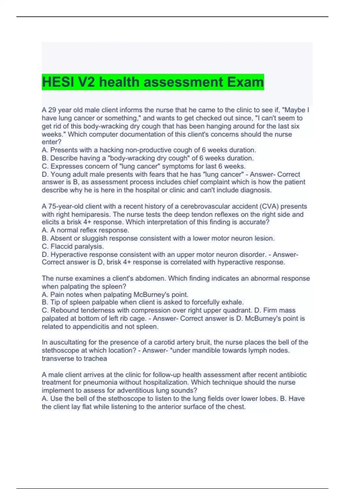 Exam (elaborations) HESI V2 health assessment Exam Questions with 100% correct Answers 2 Exam (elaborations) HESI RN Health Assessment Questions and Answers Graded A 3 Exam (elaborations) HESI Prep - Health Assessment Practice Questions and Answers 4 Exam (elaborations) HESI Prep - Health Assessment Practice Questions and Answers 5 Exam (elabo
