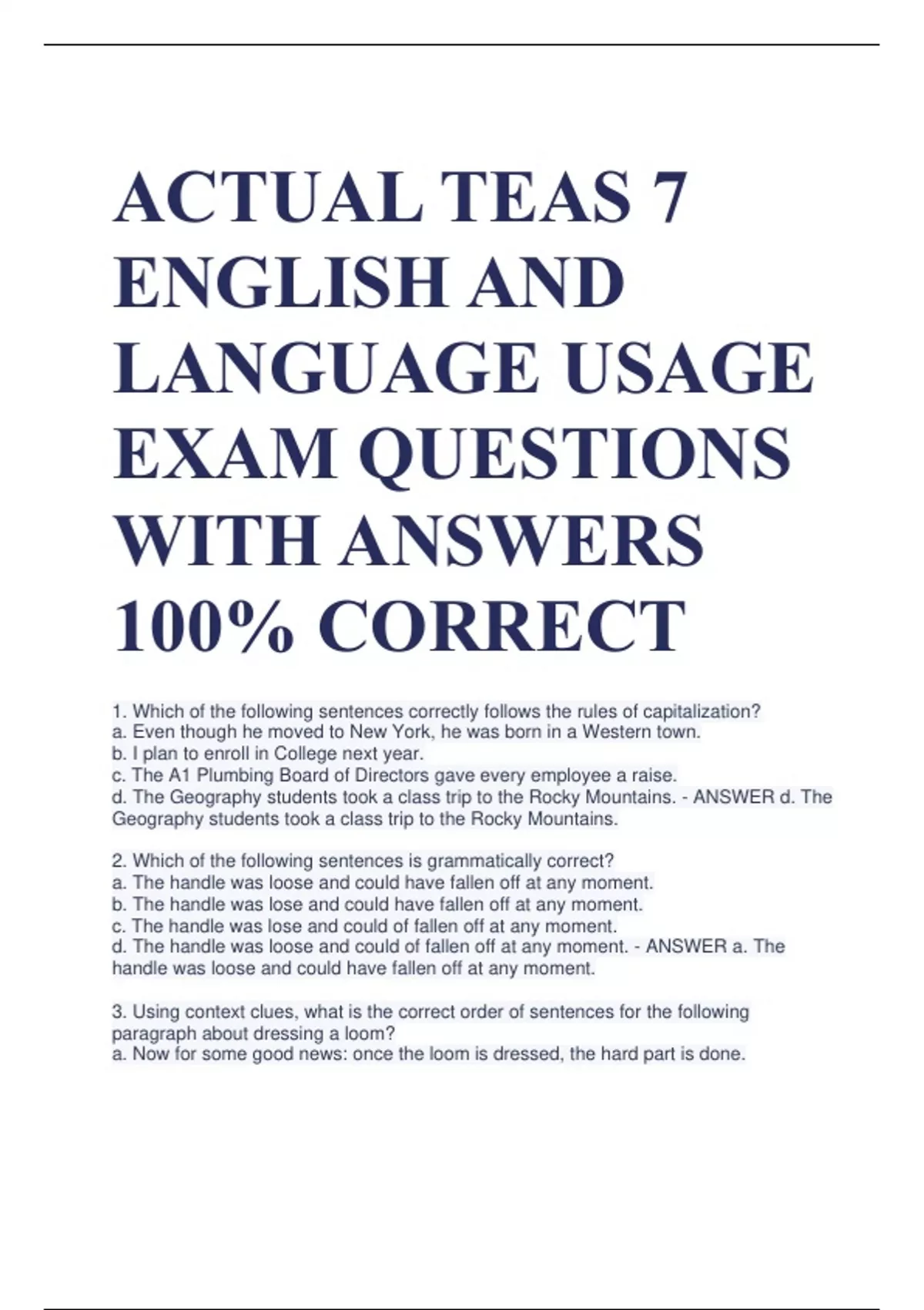 ACTUAL TEAS 7 ENGLISH AND LANGUAGE USAGE EXAM QUESTIONS WITH ANSWERS 100% CORRECT