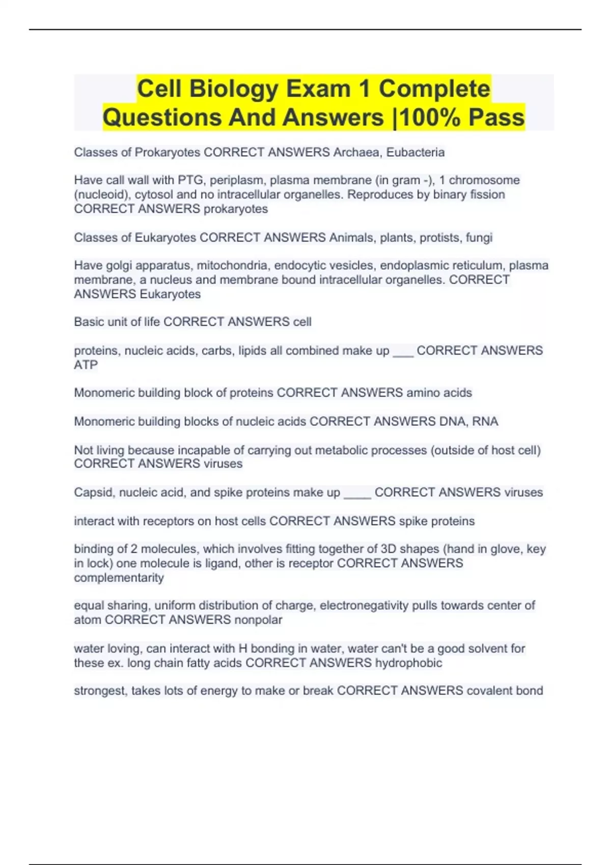 Cell Biology Exam 1 Complete Questions And Answers |100% Pass Cell Biology Exam Practice Questions With Verified Answers Cell Biology Practice Test Questions And Answers Graded A+ Cell Bio Exam 1 Questions And Complete Solutions