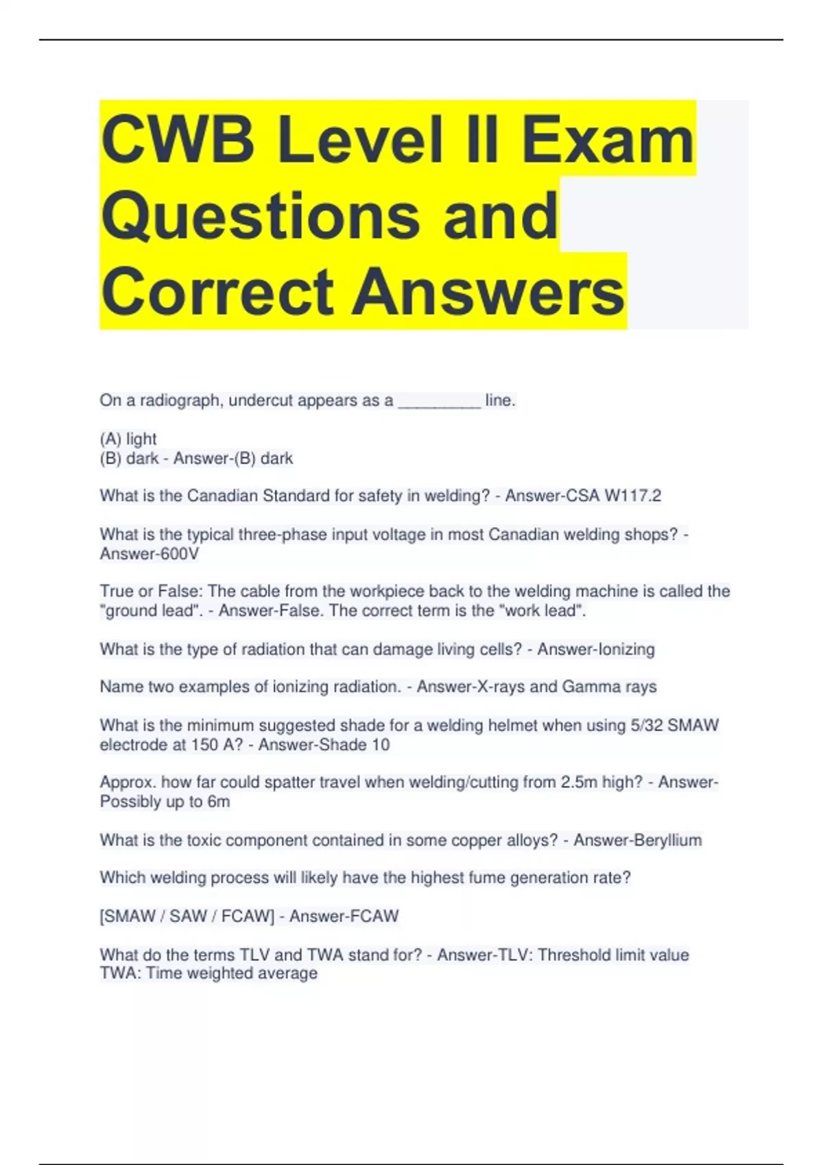 1 Exam (elaborations) CWB Exam Questions with Correct Answers 2 Exam (elaborations) CWB 1 Exam Questions with Correct Answers 3 Exam (elaborations) CWB Level 2 Exam Questions with Correct Answers 4 Exam (elaborations) CWB 47.1 Exam Questions with Correct Answers 5 Exam (elaborations) CWB Level II Exam Questions with Correct Answers 6 Exam (ela