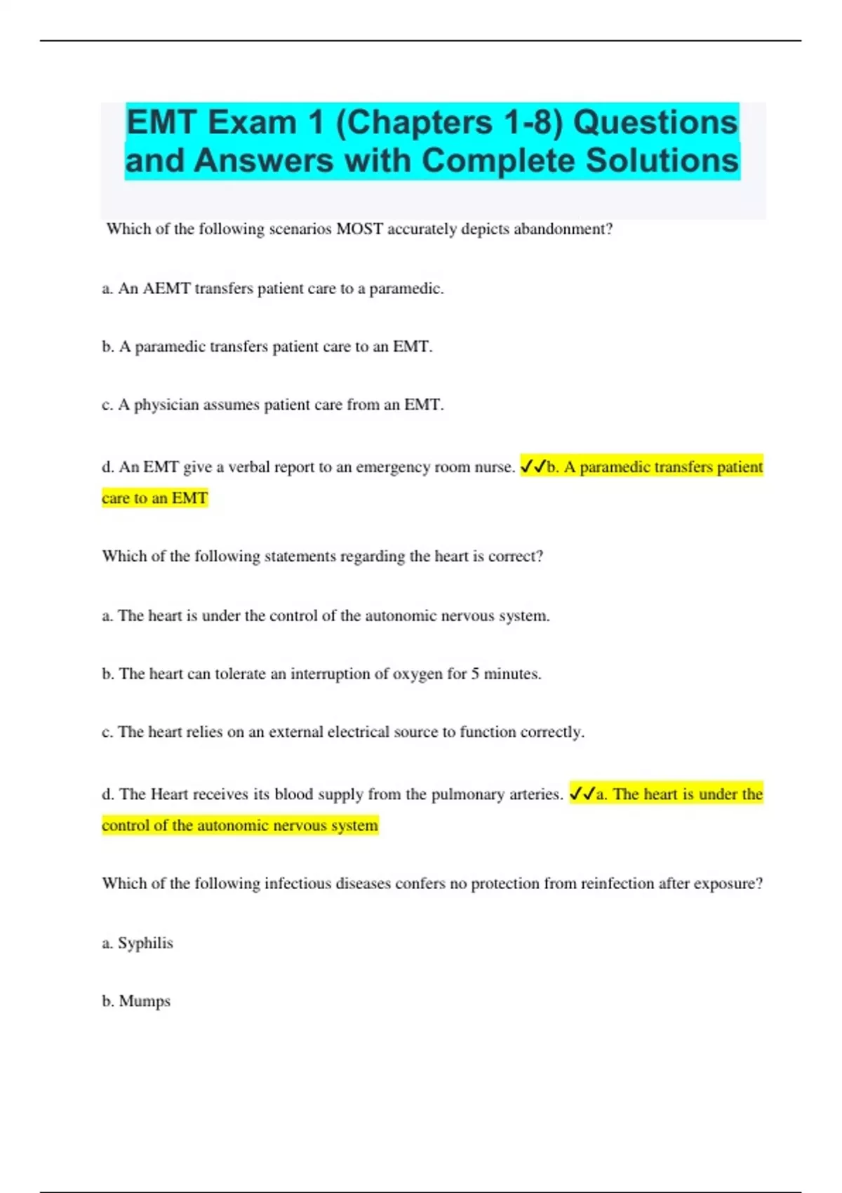 EMT Exam 1 (Chapters 1-8) Questions and Answers with Complete Solutions EMT Chapter 1: Intro to Emergency Medical Care Questions and Answers Already Passed EMT Basic Questions and Answers Rated A EMT Quizzes Study Set Chapters 1-21 (Midterm) Already Passed EMT Class Exam I 100% Pass