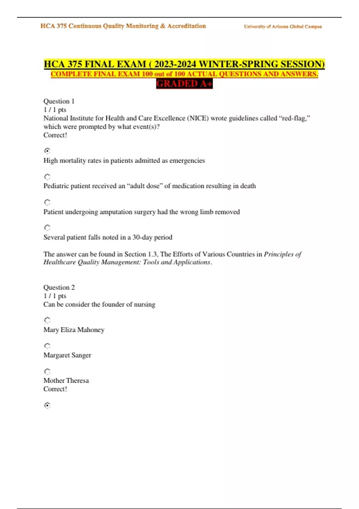 HCA 375 FINAL EXAM ( WINTER-SPRING SESSION) COMPLETE FINAL EXAM 100 out of 100 ACTUAL QUESTIONS AND ANSWERS. GRADED A+