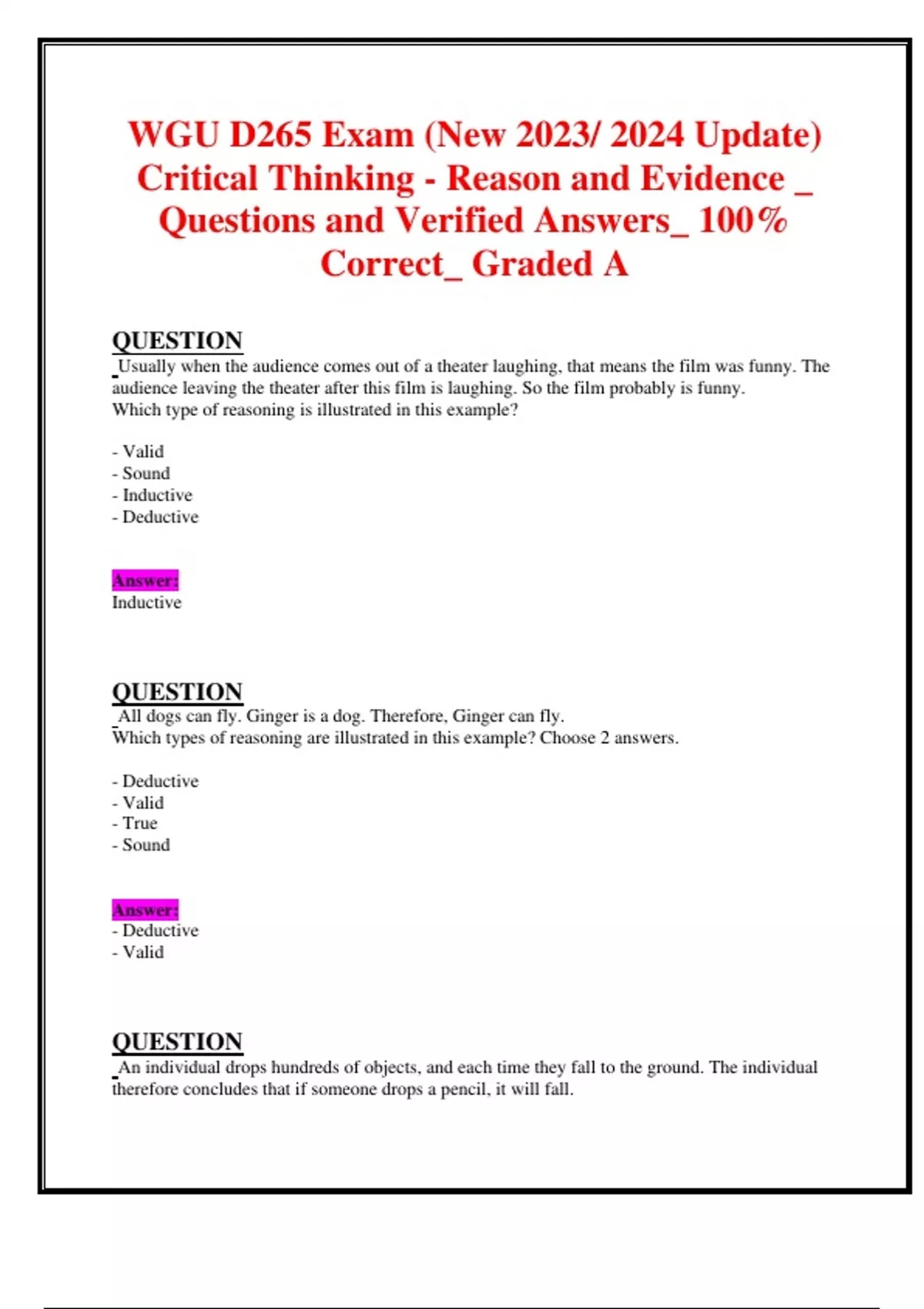 WGU D265 Exam Review (New 2023/ 2024 Update) Critical Thinking - Reason and Evidence _ Questions and Verified Answers_ 100% Correct_ Graded A