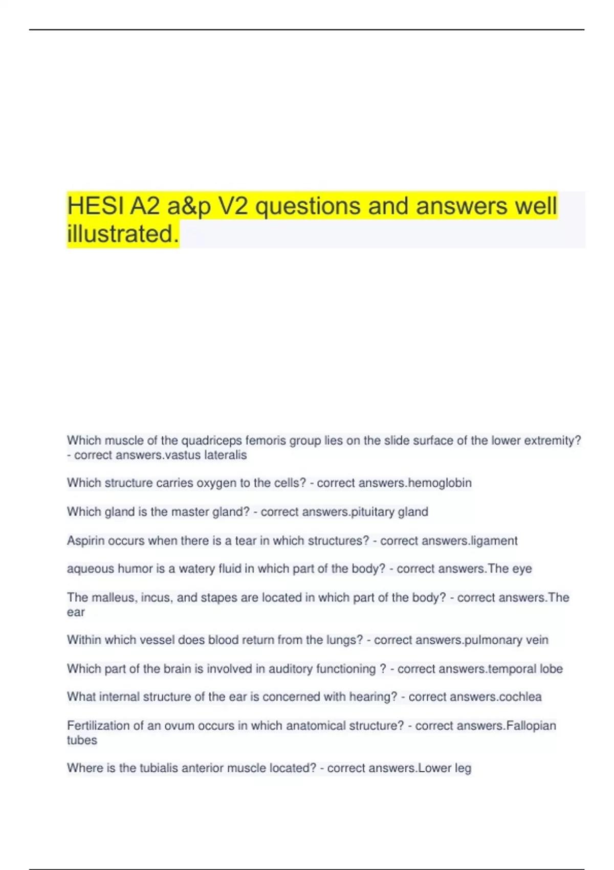 HESI A2 V2 Grammar questions and answers well illustrated. 2 Exam (elaborations) Hesi A2 v2 grammar questions and answers 100% verified 3 Exam (elaborations) HESI A2 V1- Critical Thinking Questions with correct answers 4 OTHER Hesi A2 Reading V2 questions and answers 100% verified. 5 Exam (elaborations) HESI A2 Reading Comprehension V1/V2 2023