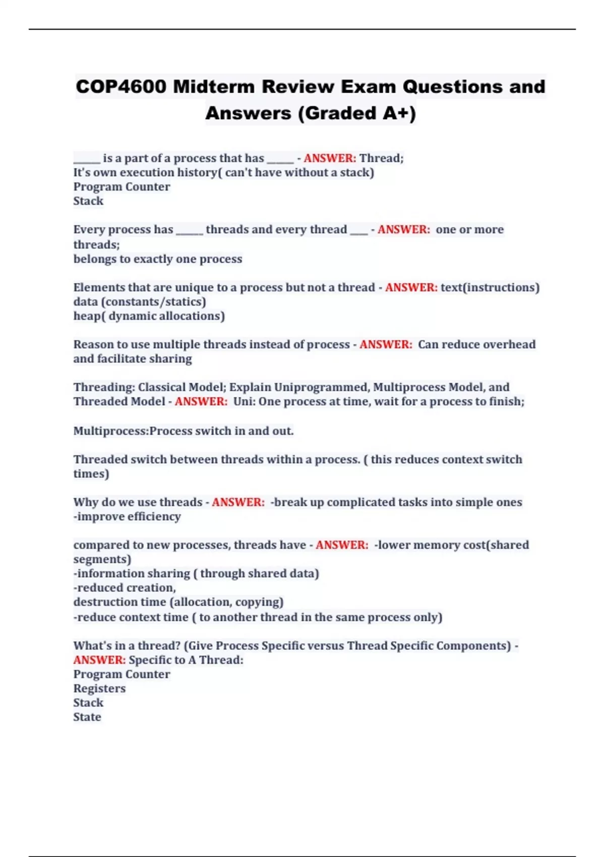 COP4600 Final Combined Exam Questions and Answers 100% Solved