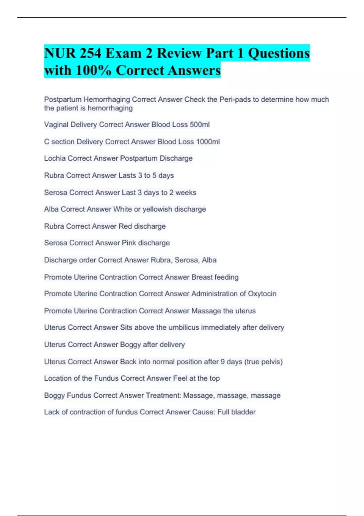 NUR 254 Bundled Package Exam 1 Questions with 100% Correct Answers