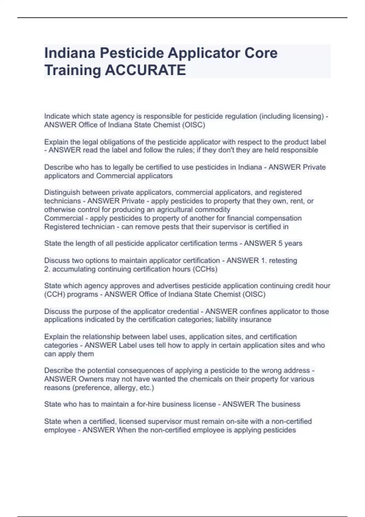 Indiana Pesticide Applicator Core Training - All Sections 100% RATED A+ COMPLETE PACKAGE DEALIndiana Pesticide Applicator Core Training - All Sections 100% RATED A+ COMPLETE PACKAGE DEALIndiana Pesticide Applicator Core Training - All Sections 100% RATED A+ COMPLETE PACKAGE DEAL