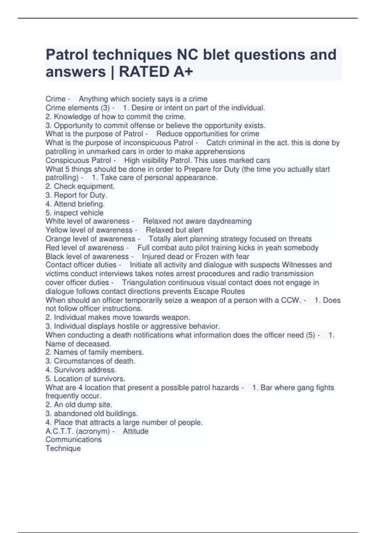 UPDATED NC BLET Patrol Techniques Exam | Bundle
