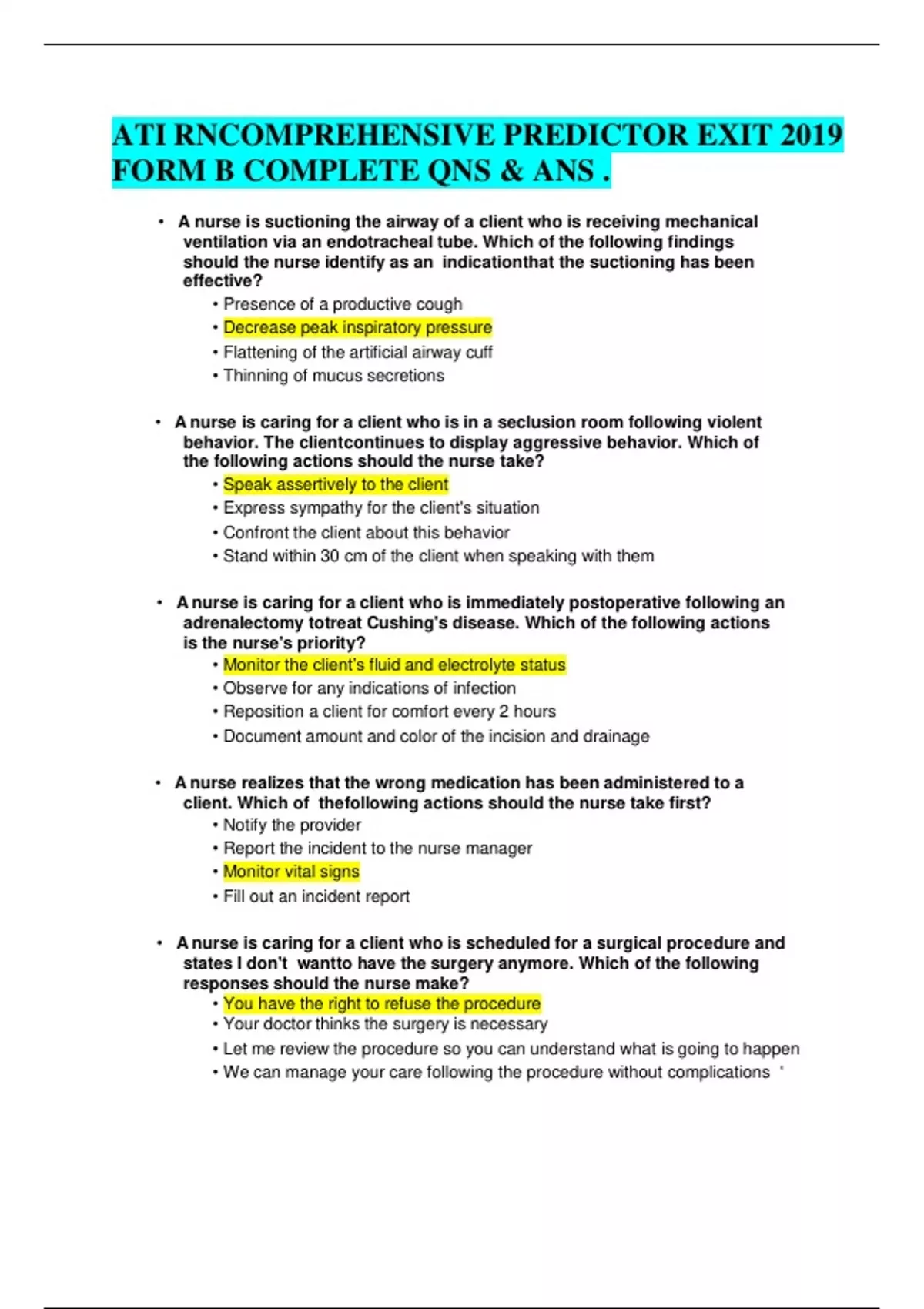 ATI RNCOMPREHENSIVE PREDICTOR EXIT 2019 FORM B COMPLETE QNS & ANS .||RN ATI ADULT MEDSURG PROCTORED 2023 VERSION LATEST VERSION||EMT FINAL EXAM 2023 WITH ALL THE CORRECT ANSWERS (ACTUAL GRADED A+)