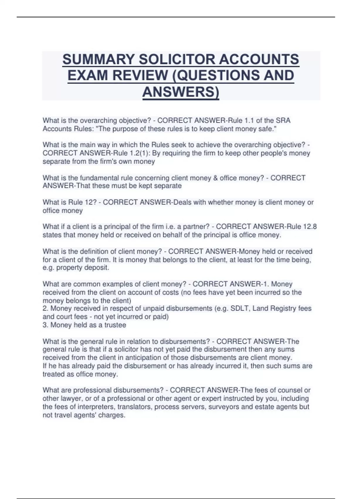 Package deal for SUMMARY SOLICITORS ACCOUNTS UPGRADED EXAM WITH CORRECT ANSWERS