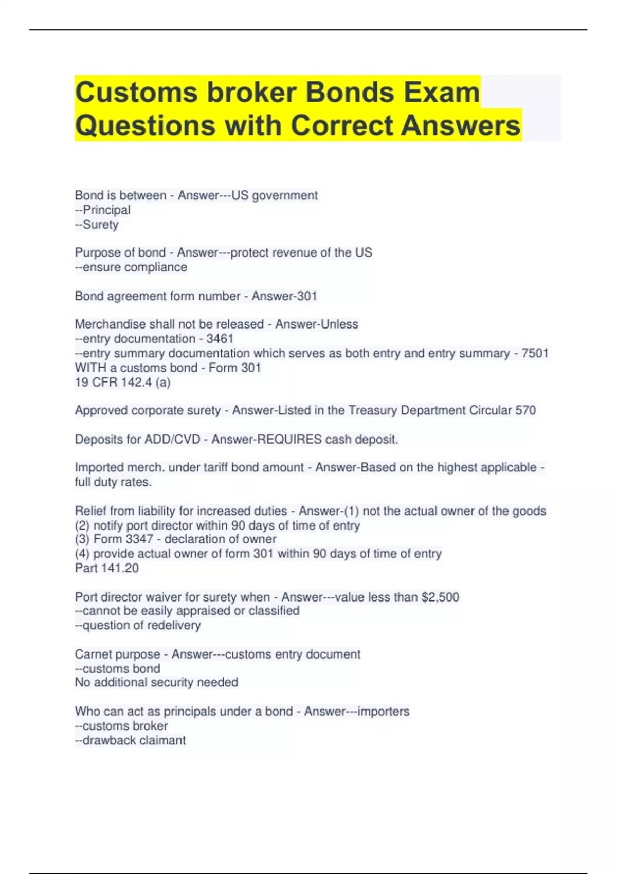 Bundle For Customs Broker Exam Questions and Answers All Correct