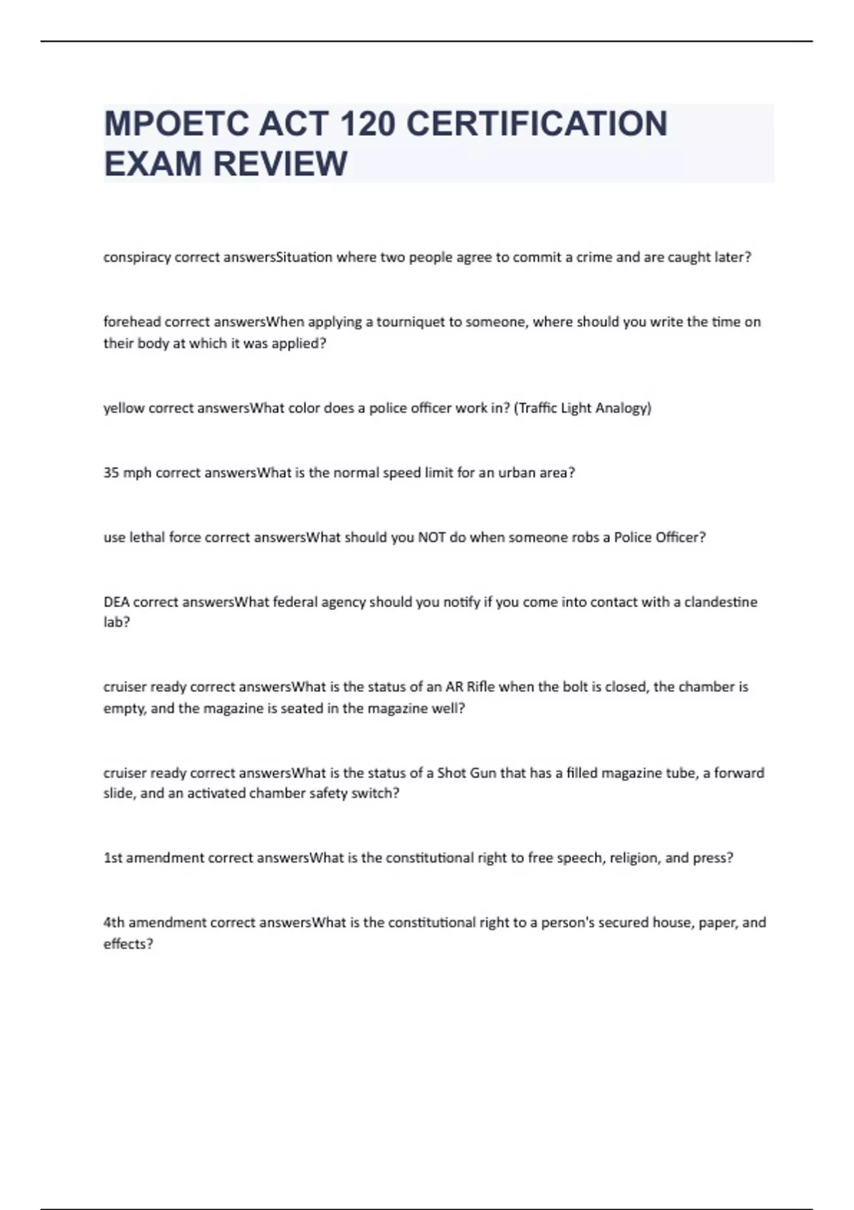 MPOETC ACT 120 CERTIFICATION EXAM REVIEW WITH 100% CORRECT ANSWERS