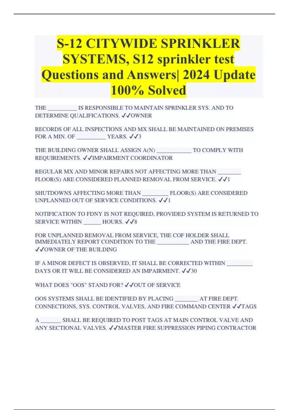 S12 Sprinkler Bundled Exams Full Solution Pack 100% Verified