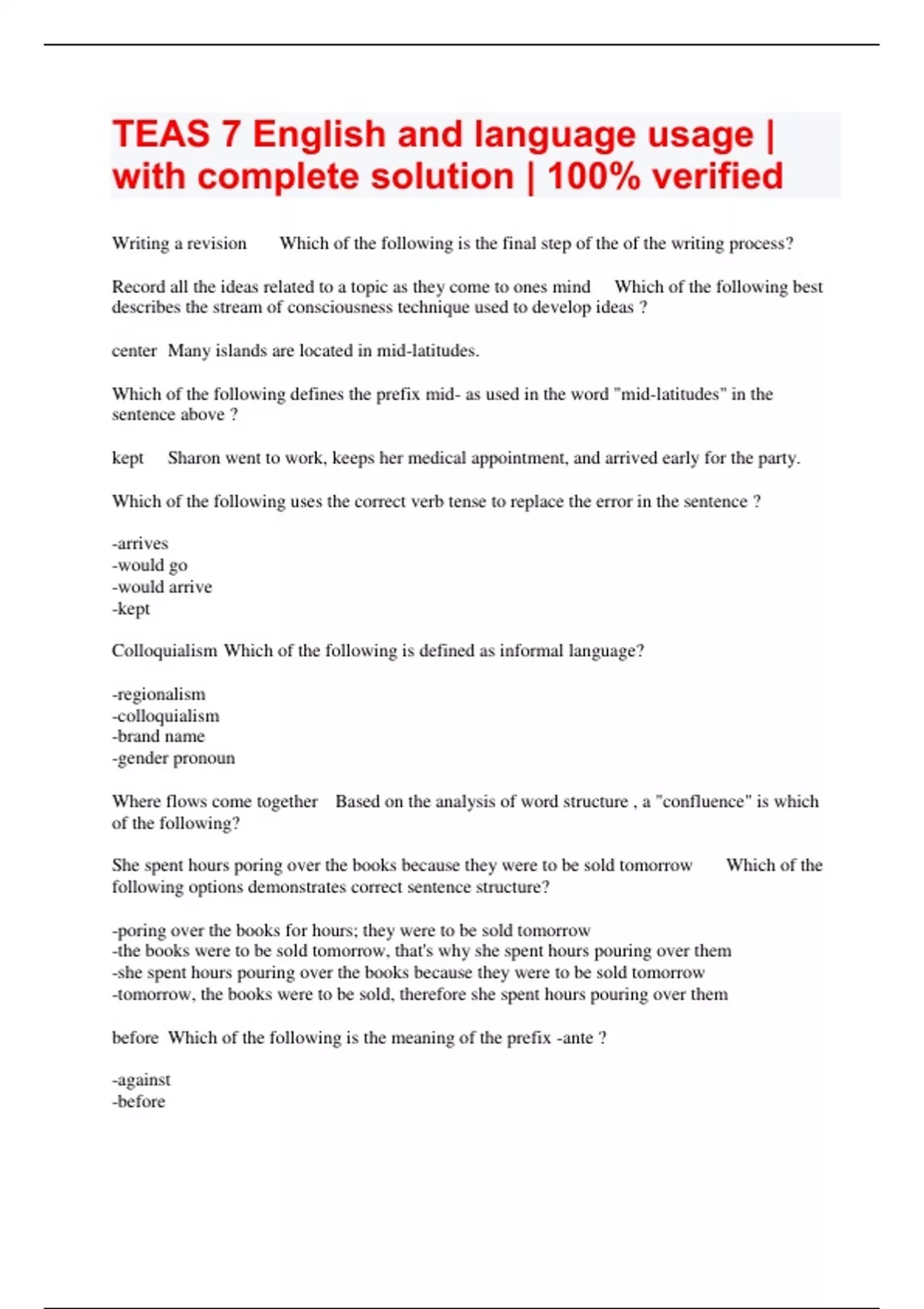 Exam (elaborations) ATI TEAS version 7 English and Language | with complete solution | UPDATED 2024/2025 ATI TEAS 7 - English & Language Usage | EXAM QUESTIONS AND ANSWERS | RATED A+ TEAS 7 English and language usage | with complete solution | 100% verified ATI TEAS PRACTICE TEST English and Language Usage | 100% VERIFIED