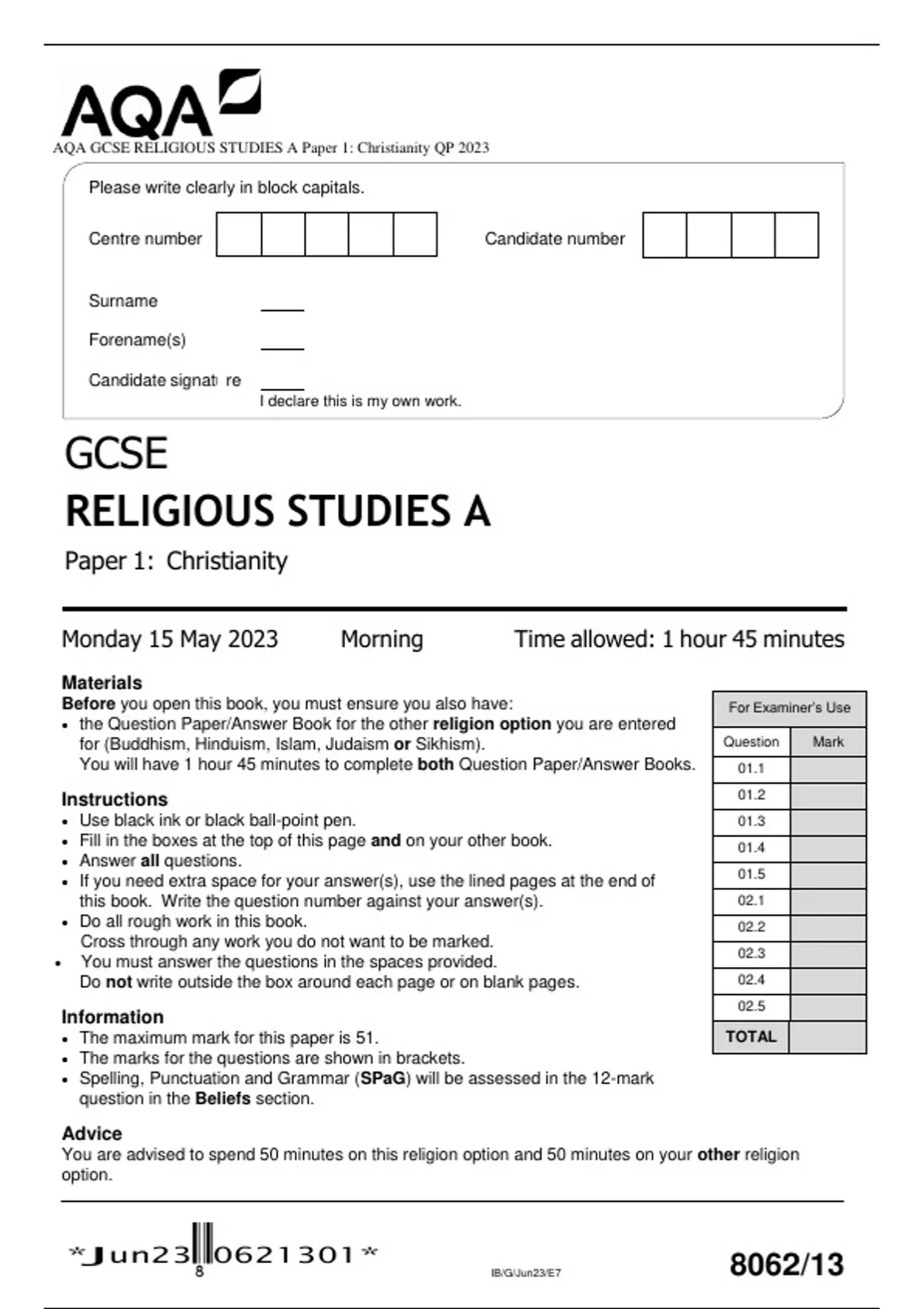 AQA GCSE RELIGIOUS STUDIES A Paper 1: Christianity QP and MS 2023