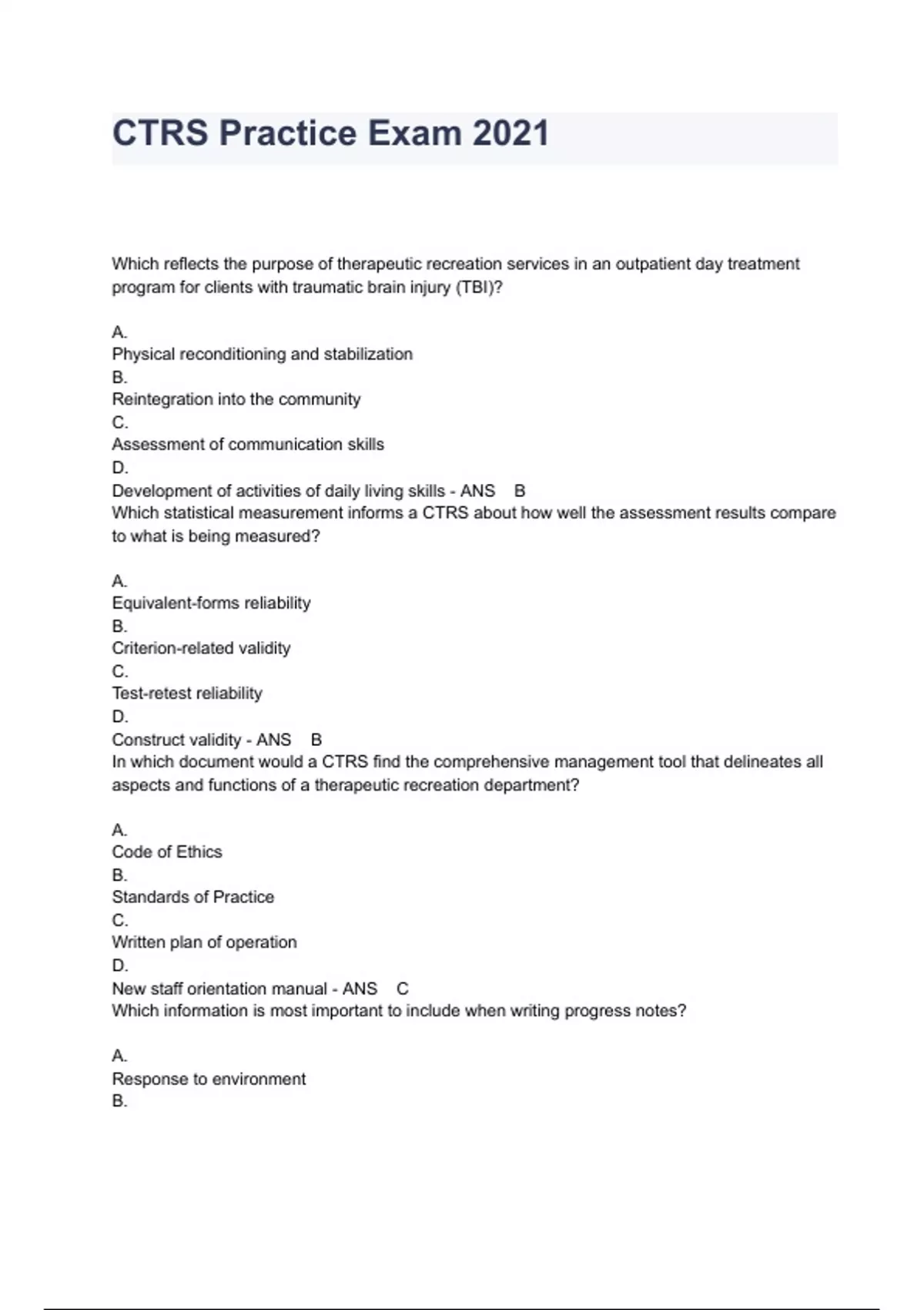 CTRS Practice Exam 2021 Questions And Answers