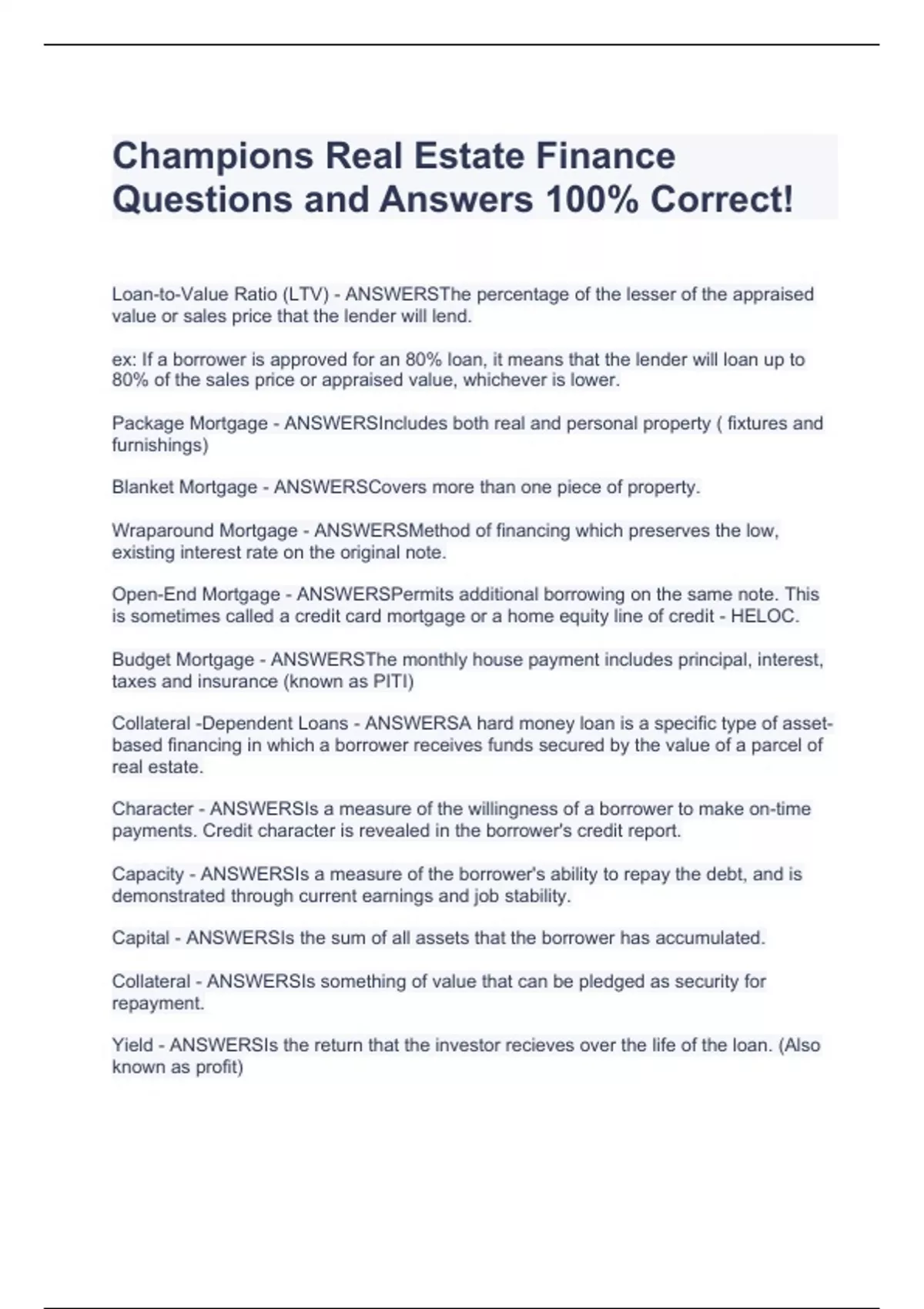 Real Estate Finance Champions Questions and Answers (scored A)