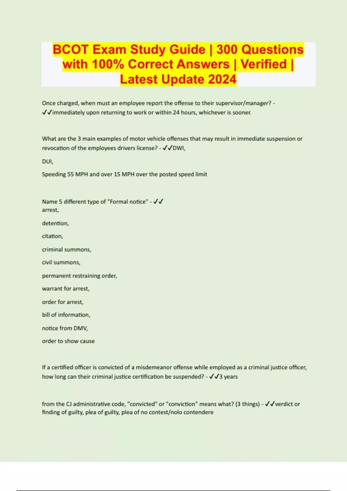 BCOT Exam Study Guide | 300 Questions with 100% Correct Answers | Verified | Latest Update 2024