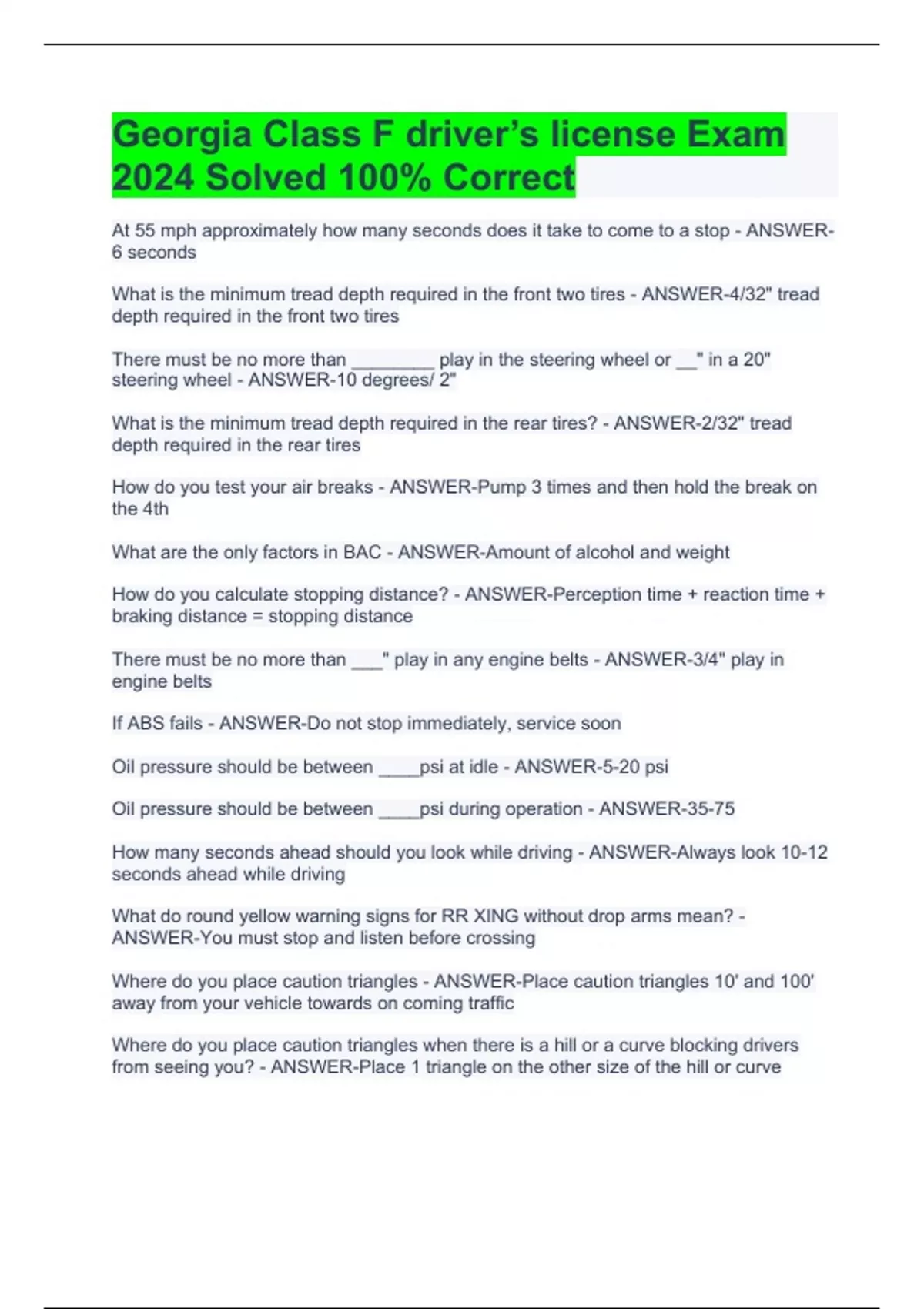 1 Exam (elaborations) Georgia Class F driver’s license Exam 2024 Solved 100% Correct 2 Exam (elaborations) GA Class F Exam 2024 Graded A+ 3 Exam (elaborations) Class F – GA Exam 2024 with Complete Solutions 4 Exam (elaborations) Georgia Commercial Driver License General Knowledge Test- 2024 5 Exam (elaborations) GA CDL Air brake practice test 2