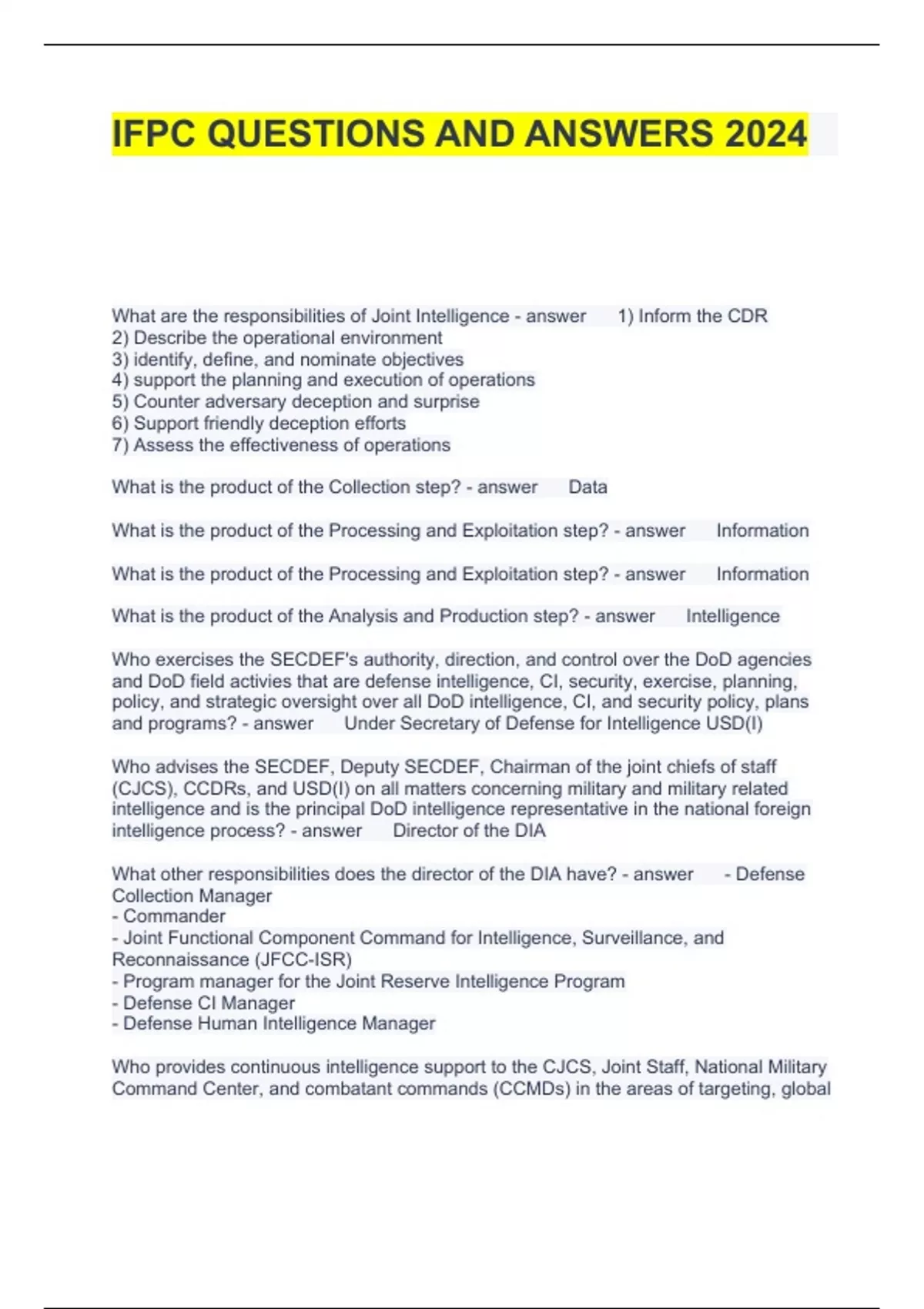Exam (elaborations) IFPC Topic 4: Why does intelligence require oversight? Questions and Answers 2024 Exam (elaborations) IFPC Topic 2: What are the Intelligence Disciplines Questions and Answers Scored A+ Exam (elaborations) IFPC Topic Area 5 How is Intelligence Conducted? Questions Verified Exam (elaborations) IFPC TOPIC AREA 1 Q